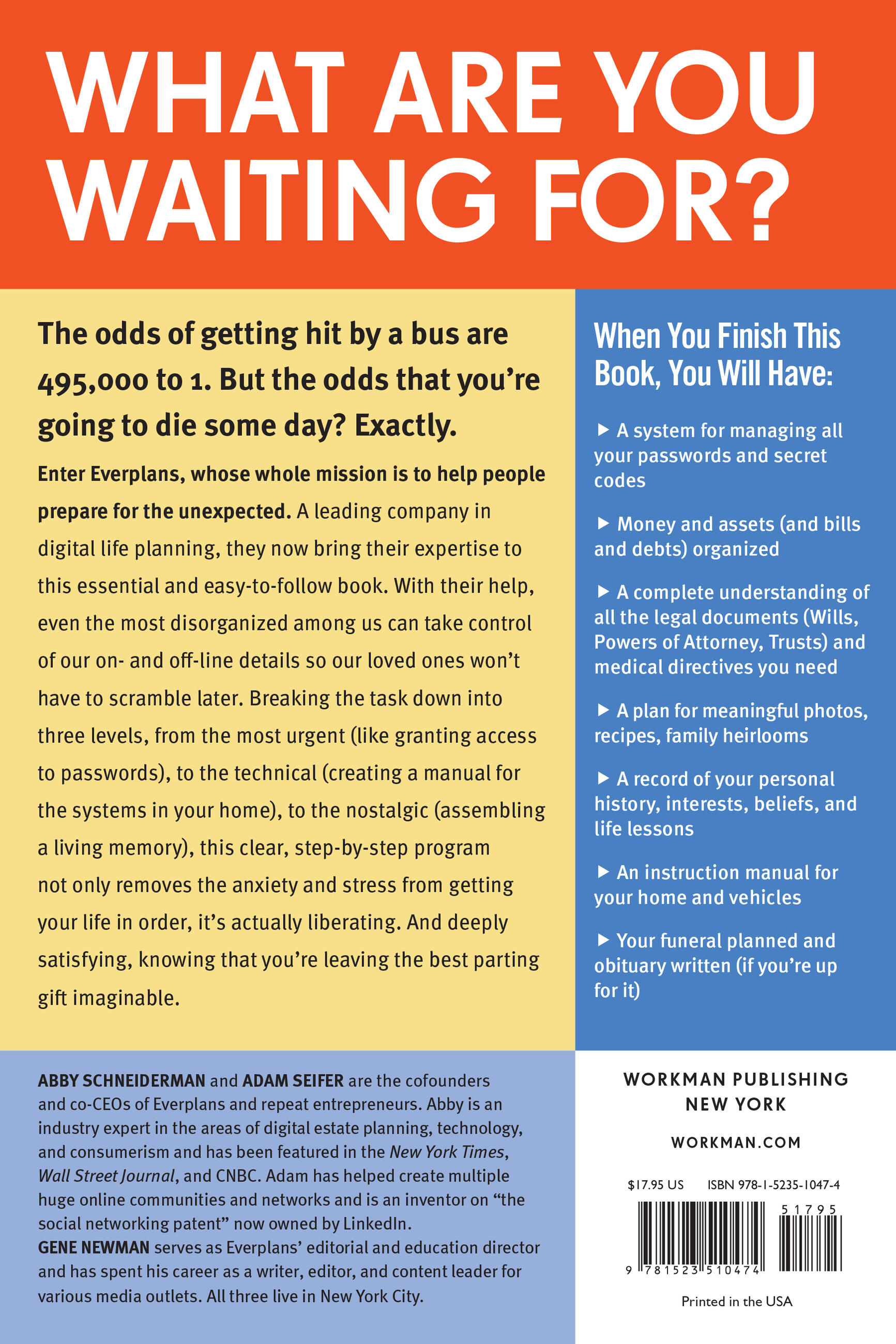 Even the most disorganized among us can take control of our on- and off-line details so our loved ones won’t have to scramble later. The experts at Everplans, a leading company in digital life planning, make it possible in this essential and easy-to-follow book. Breaking the task down into three levels, from the most urgent (like granting access to passwords), to the technical (creating a manual for the systems in your home), to the nostalgic (assembling a living memory), this clear, step-by-step program not only removes the anxiety and stress from getting your life in order, it’s actually liberating. And deeply satisfying, knowing that you’re leaving the best parting gift imaginable.