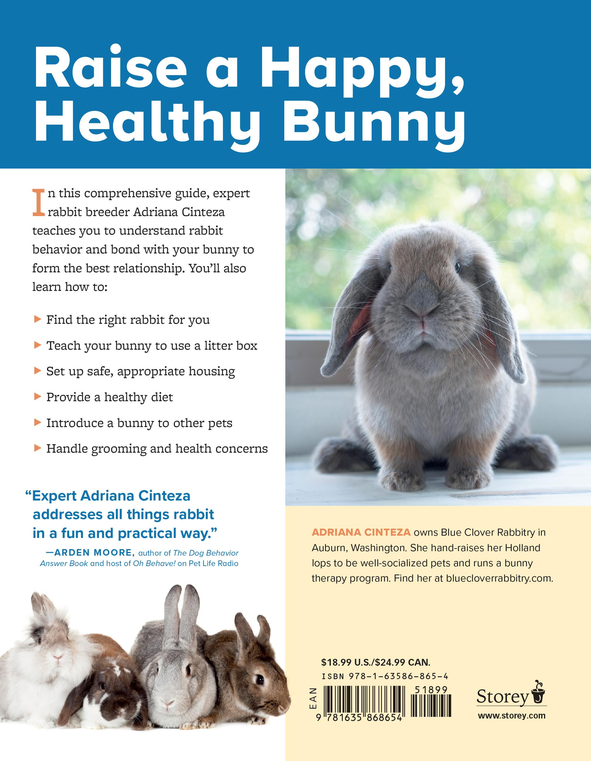 She also provides advice about the most popular and friendly bunny breeds, and shares bonding and socialization techniques that she has developed from years of experience hand-raising rabbits and hosting her popular bunny therapy sessions with Blue Clover Rabbitry.