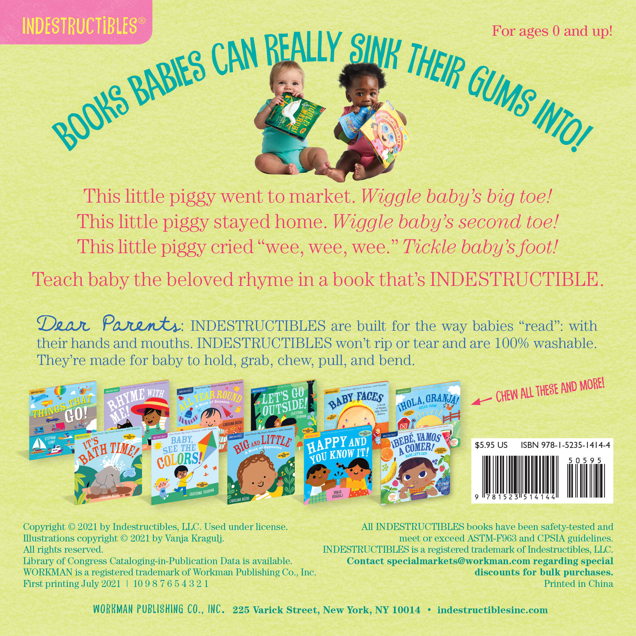 Indestructibles is the trusted series for easing little ones into story time. Beloved by babies and their parents, Indestructibles are built for the way babies “read” (i.e., with their hands and mouths) and are: