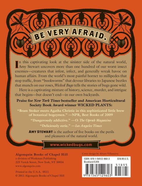 "Wicked Bugsdefines bug in the amateur sense — that is, anything creepy-crawly, including worms, snails, slugs and other insects that are not, technically speaking, bugs. A true bug, Ms. Stewart acknowledges, has six legs and wings, like all insects, as well as piercing and sucking mouthparts. And wicked, she makes clear, lies in the eye of the beholder, whether you’re a Roman with scorpions falling into your eyes or a Marylander with stink bugs falling into your hair... Wicked Bugs has some good tips for gardeners, like putting out rolled-up newspaper or cardboard tubes at night to trap earwigs and dumping them into soapy water in the morning... In fact, no bug is truly wicked. It is just eating.”B>New York TimesKirkus Reviews