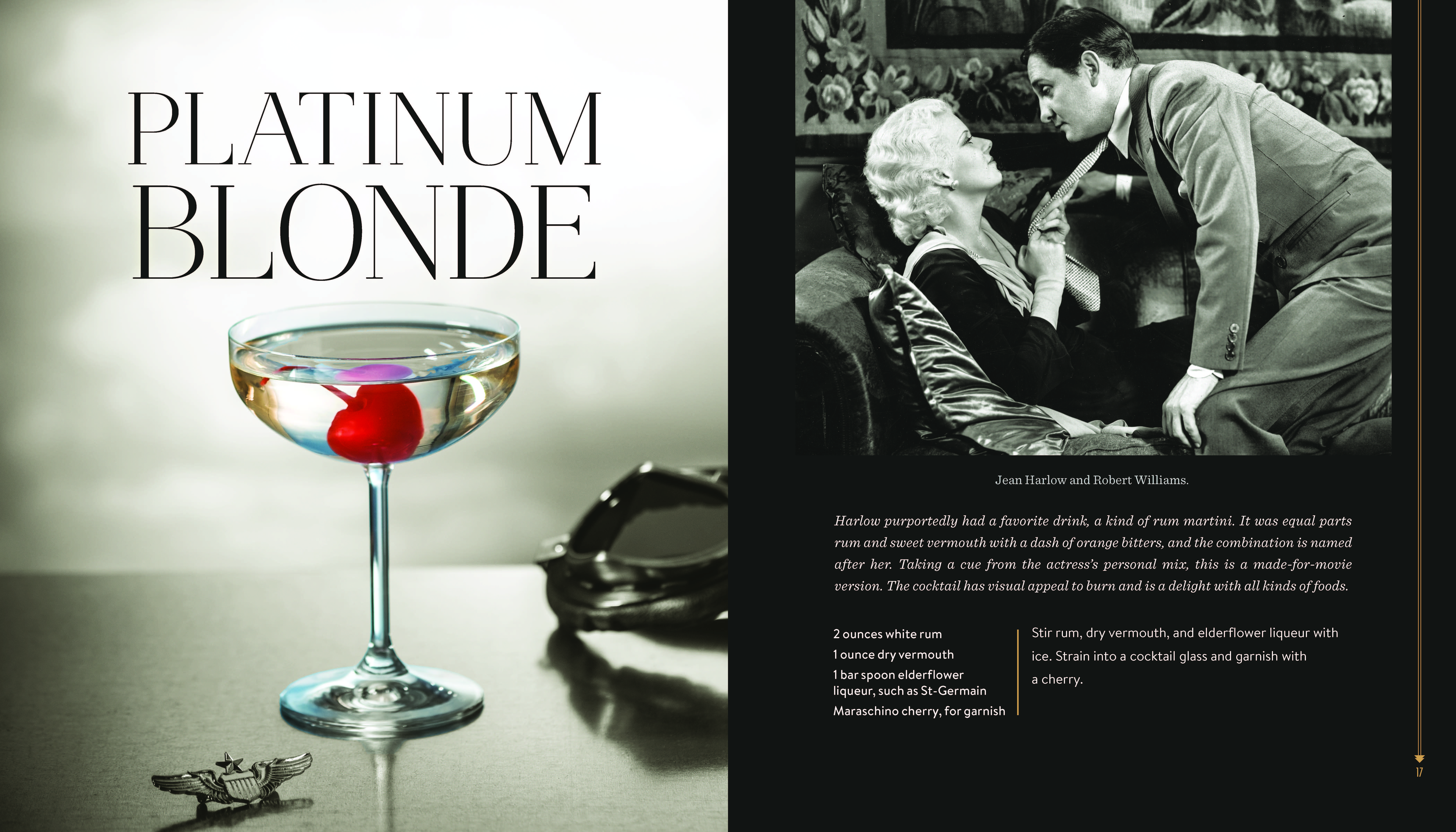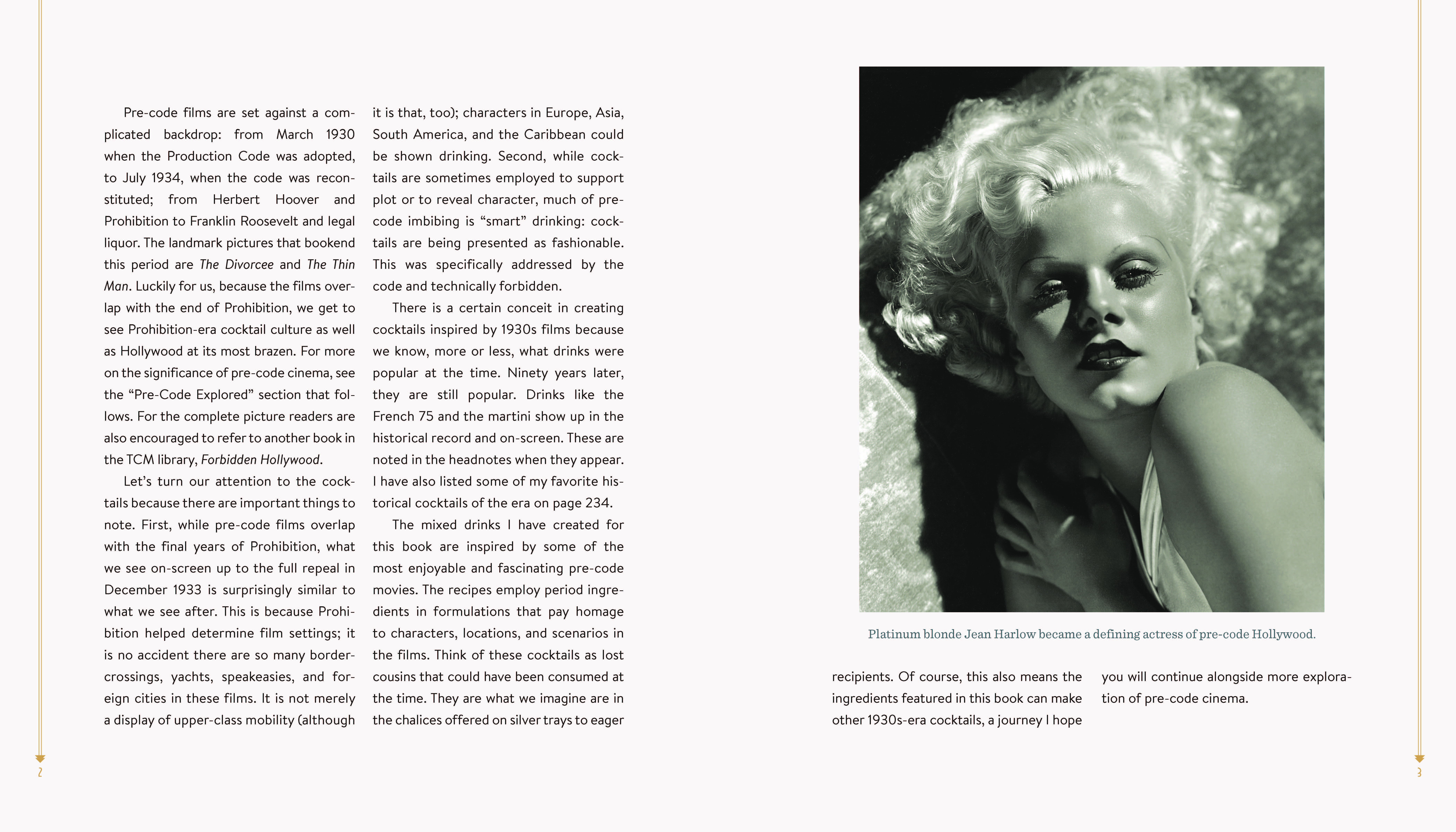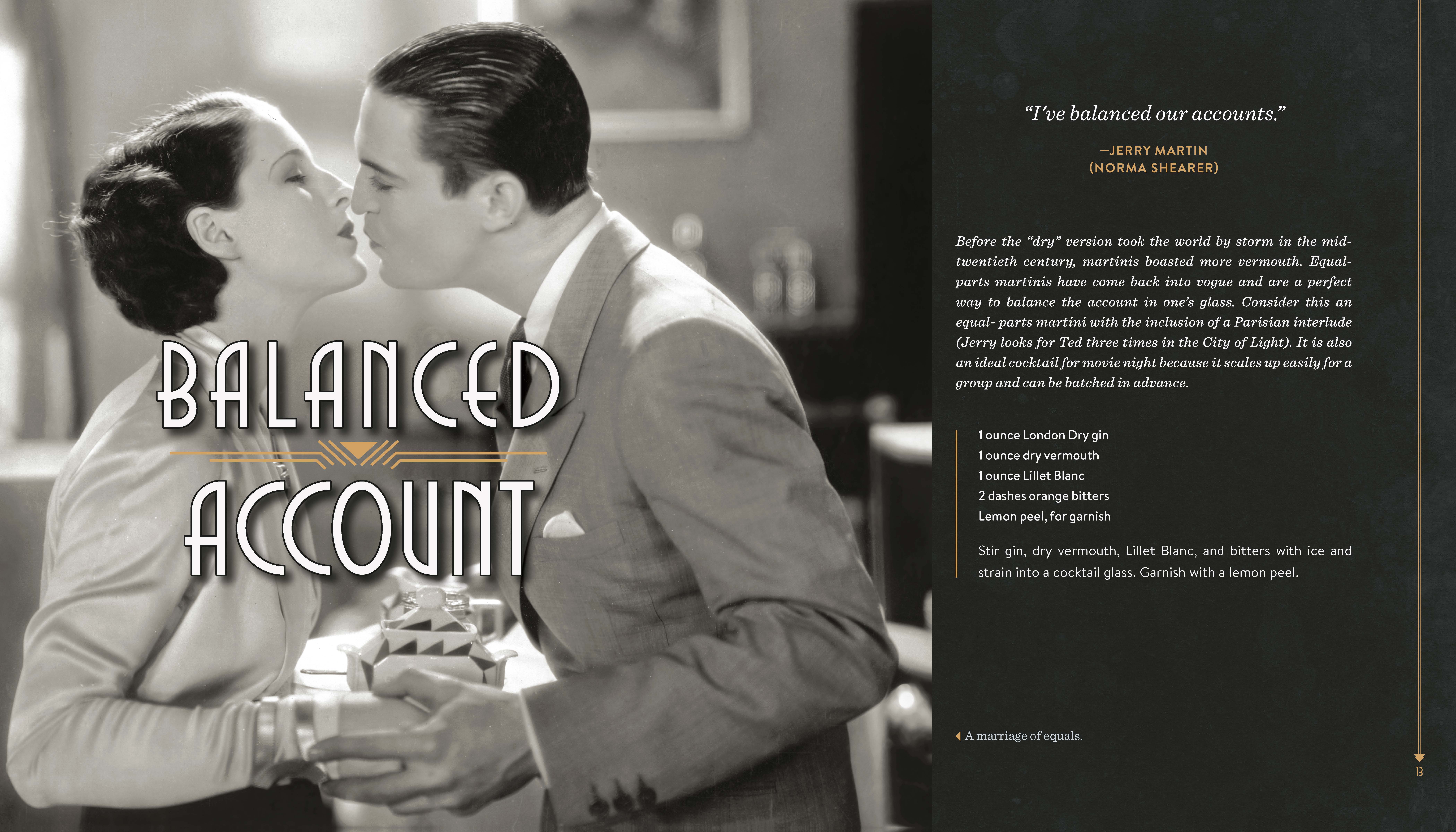 Movie-and-cocktail pairings include: The Divorcee / Balanced Account; Hell’s Angels / Platinum Blonde; Dracula / Count Draiquiri; Strangers May Kiss / Stranger’s Kiss; The Public Enemy / Tom Powers; Night Nurse / My Pal Rye; Shanghai Express / Shanghai Lily; Scarface / First Ward; One Way Passage / Passage to Paradise; Trouble in Paradise / Lubitsch Touch; Call Her Savage / Greenwich Village; Sign of the Cross / Naked Moon; Gold Diggers of 1933 / Pettin’ in the Park; Flying Down to Rio / Hotel Hibiscus; It Happened One Night / It Happened One Morning; The Thin Man / Asta