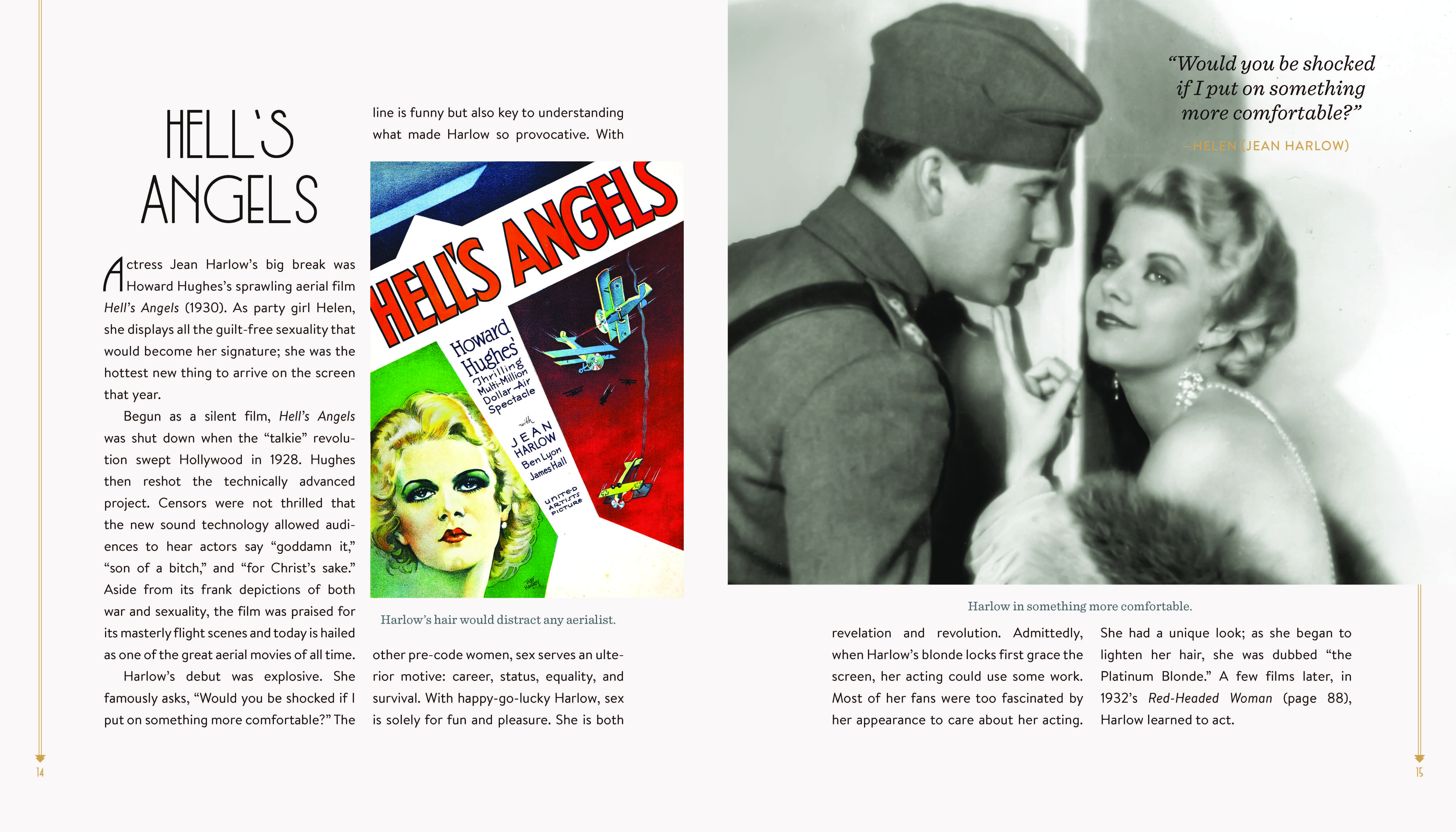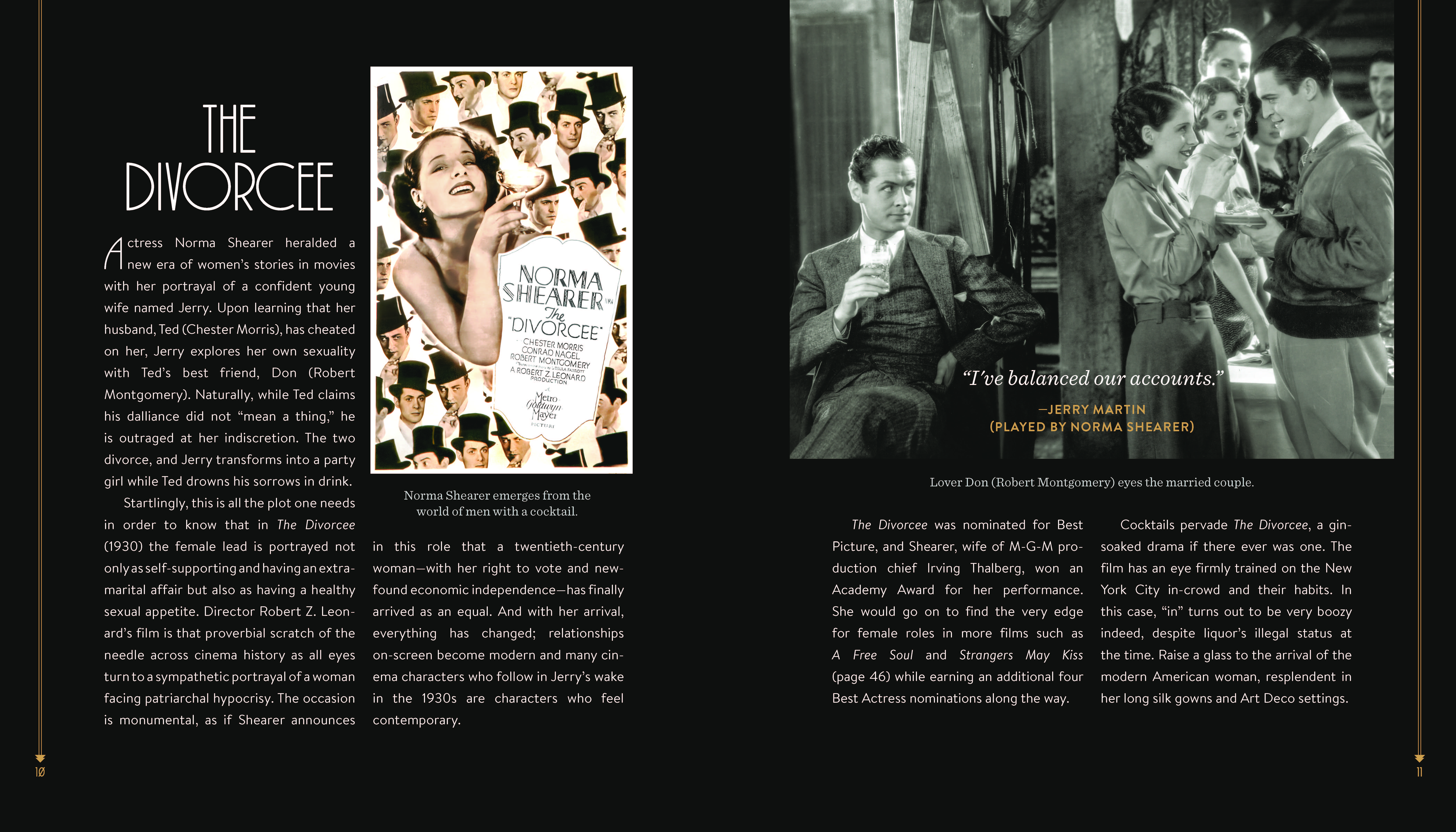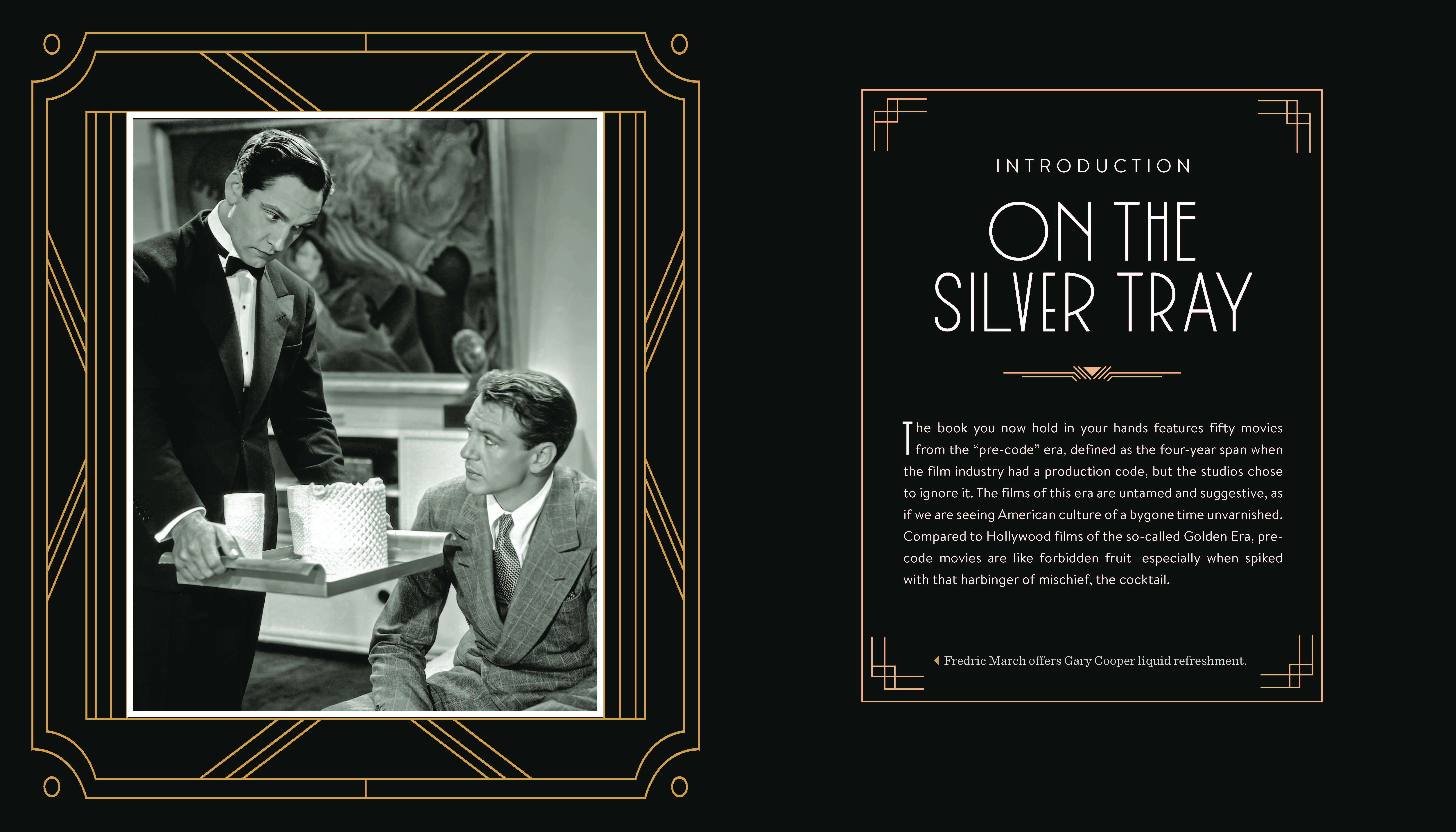 Movie-and-cocktail pairings include: The Divorcee / Balanced Account; Hell’s Angels / Platinum Blonde; Dracula / Count Draiquiri; Strangers May Kiss / Stranger’s Kiss; The Public Enemy / Tom Powers; Night Nurse / My Pal Rye; Shanghai Express / Shanghai Lily; Scarface / First Ward; One Way Passage / Passage to Paradise; Trouble in Paradise / Lubitsch Touch; Call Her Savage / Greenwich Village; Sign of the Cross / Naked Moon; Gold Diggers of 1933 / Pettin’ in the Park; Flying Down to Rio / Hotel Hibiscus; It Happened One Night / It Happened One Morning; The Thin Man / Asta