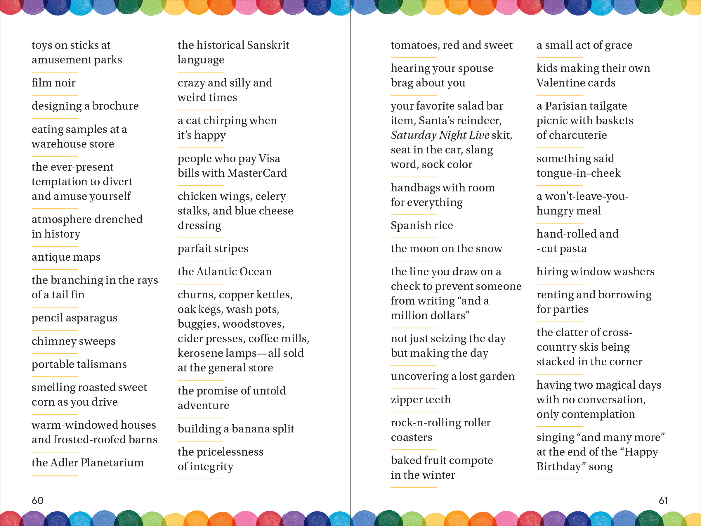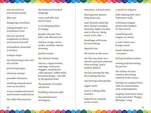 With more than 1.5 million copies in print, 14,000 Things to Be Happy About is the iconic impulse gift book that celebrates all the little things that make life worth living. Now it is even more of a mood-altering pick-me-up, with the use of cheerful watercolors throughout plus redesigned pages, all of which give this new edition a fresh, joyous feeling. At the heart, though, is its unique list of thousands of items, places, thoughts, and moments that make us happy. No opinions, no explanations, no asides or footnotes. It’s mesmerizing. And as an antidote to the all-too-many things to be unhappy about, it could not be more welcome.
