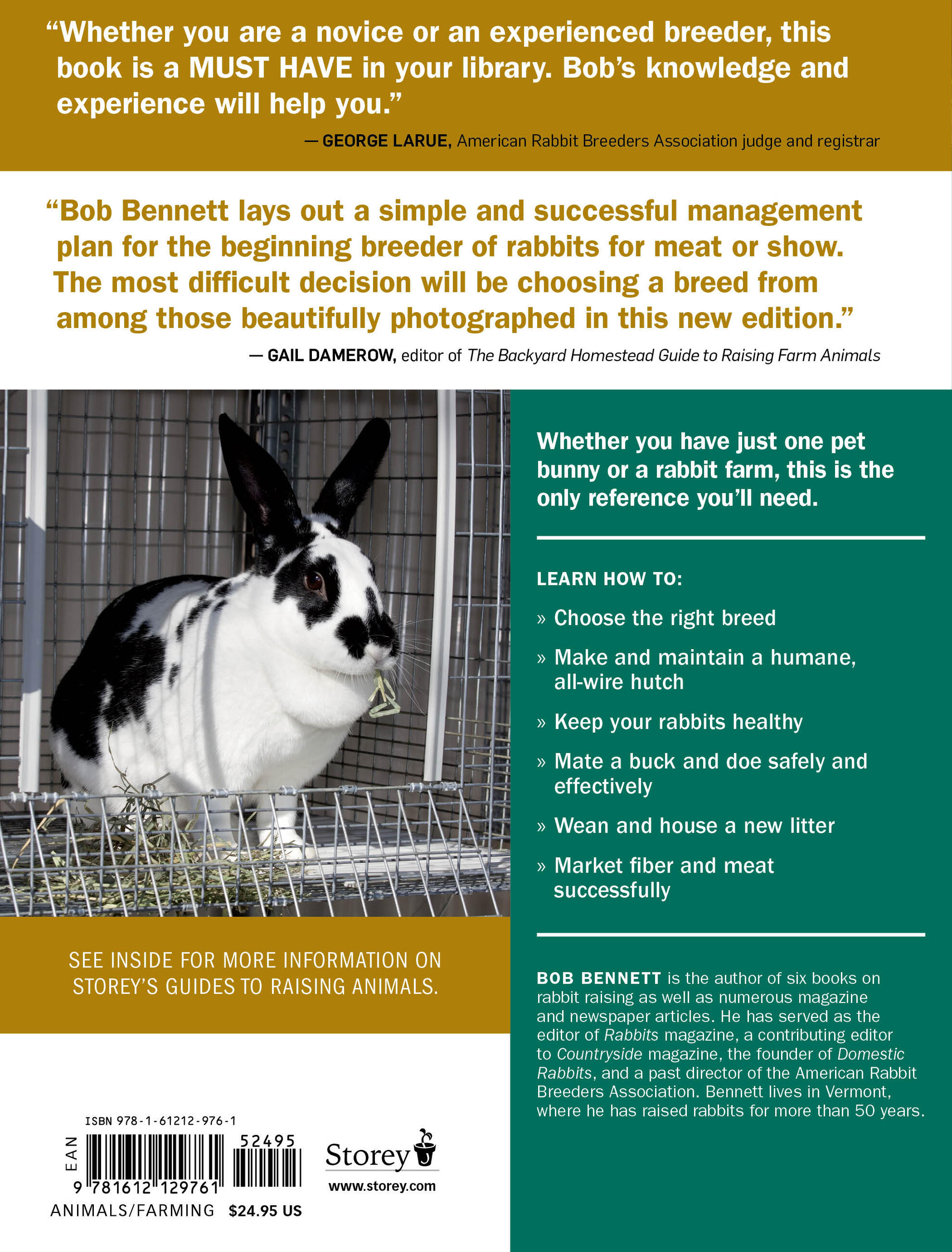 “Bob Bennett lays out a simple and successful management plan for the beginning breeder of rabbits for meat or show. The most difficult decision will be choosing a breed from among those beautifully photographed in this new edition.” — Gail Damerow, editor of The Backyard Homestead Guide to Raising Farm Animals