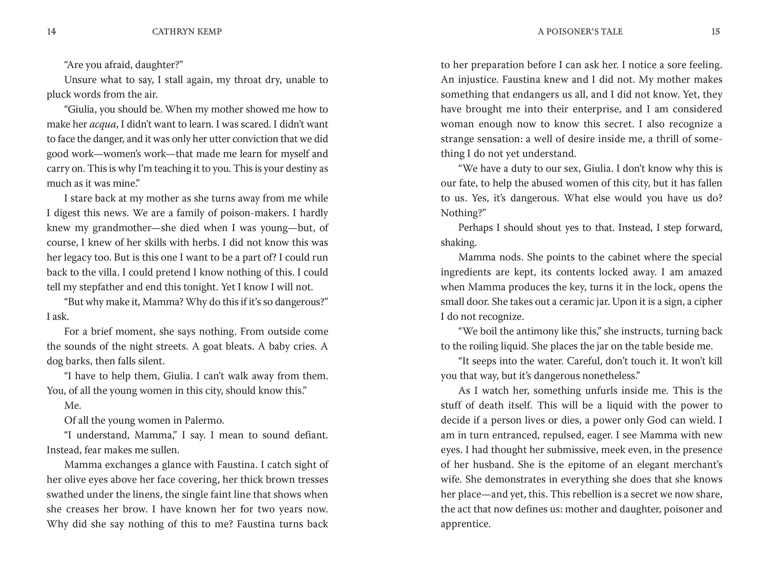 Palermo 1632: Giulia is thirteen when she learns her mother greatest secret: Teofania makes an undetectable, slow-acting, lethal poison—Acqua Tofana—which she uses to free the broken and abused women of Palermo. Now Teofania wants to pass her recipe on to her daughter, and Giulia soon realizes that in a time when women have no voice, justice is sometimes best served in a cup of wine or broth.