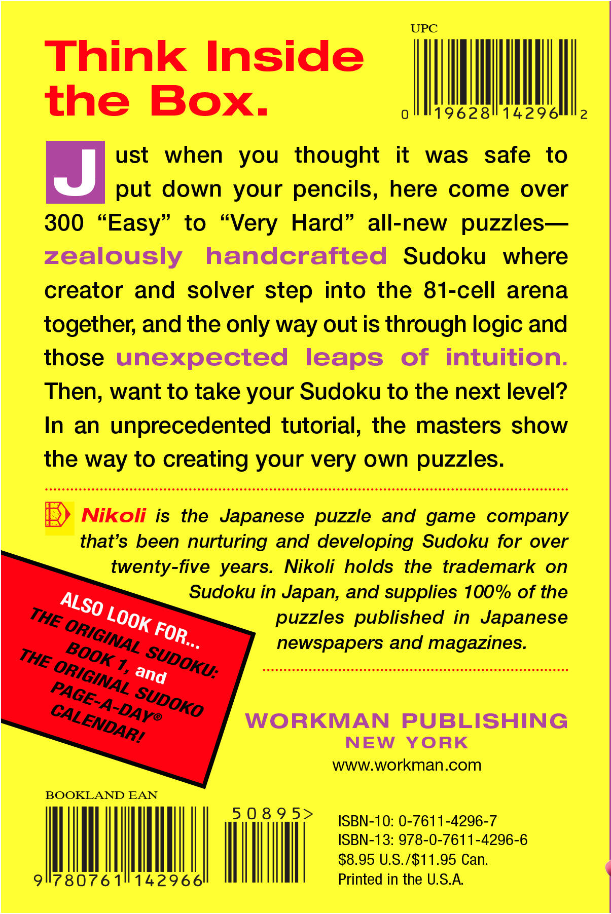 Other features? More all-new puzzles—over 300, arranged from “Easy” to “Very Hard.” The same chunky, easy-to-tote format, because once addicted you will be toting it around everywhere. An informative introduction that shows you how to approach and solve the puzzles. Plus an entirely new idea—an unprecedented tutorial on how to create your very own handmade Sudoku puzzles.