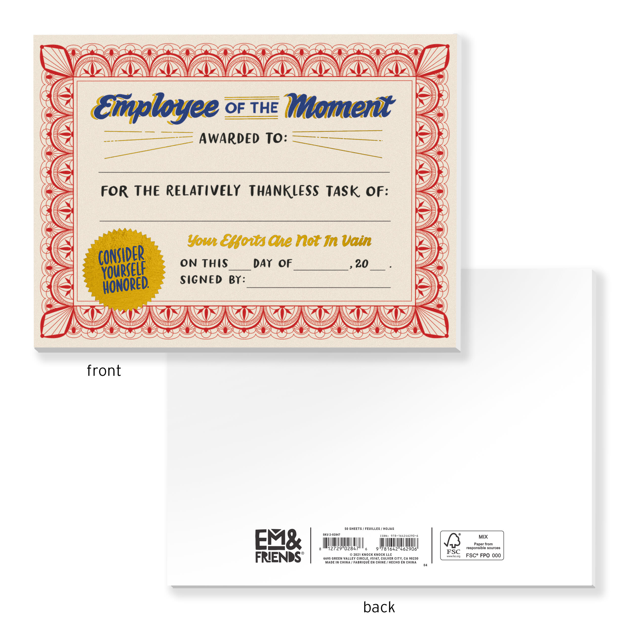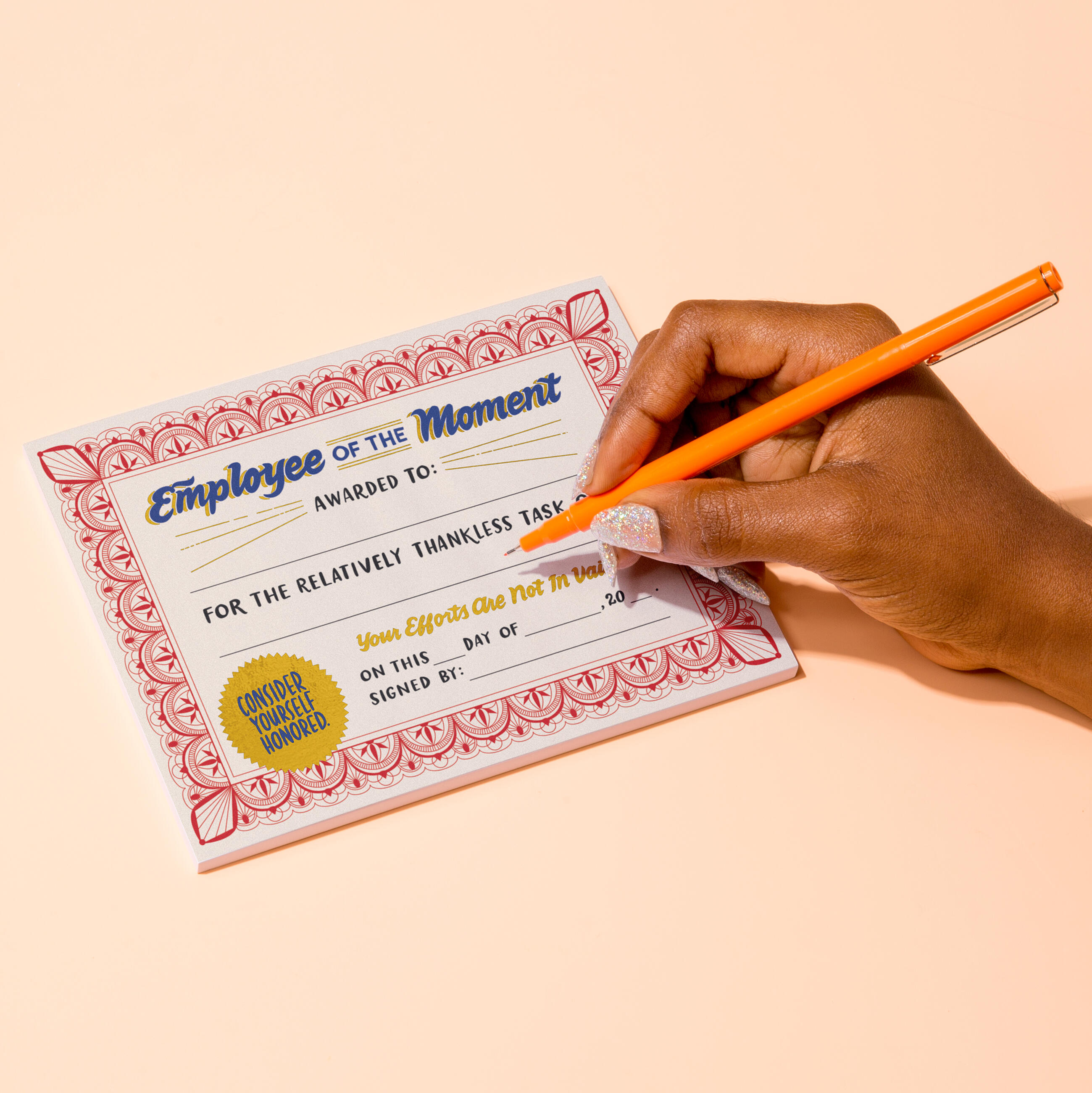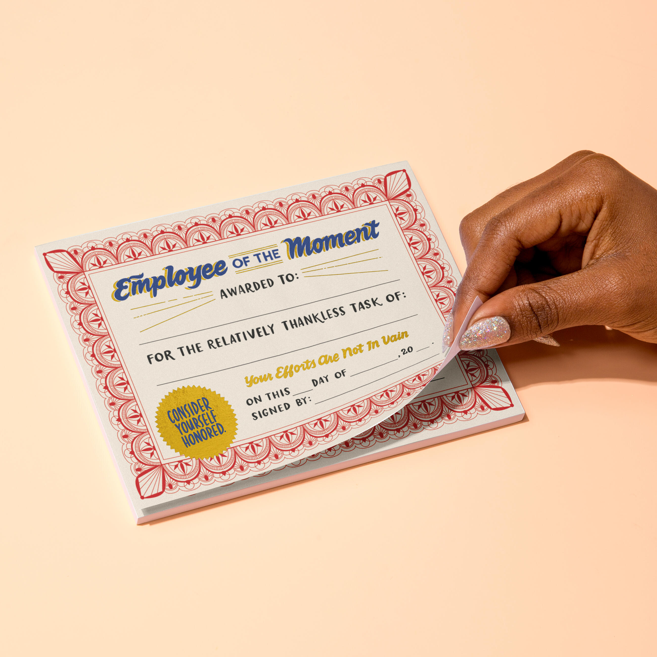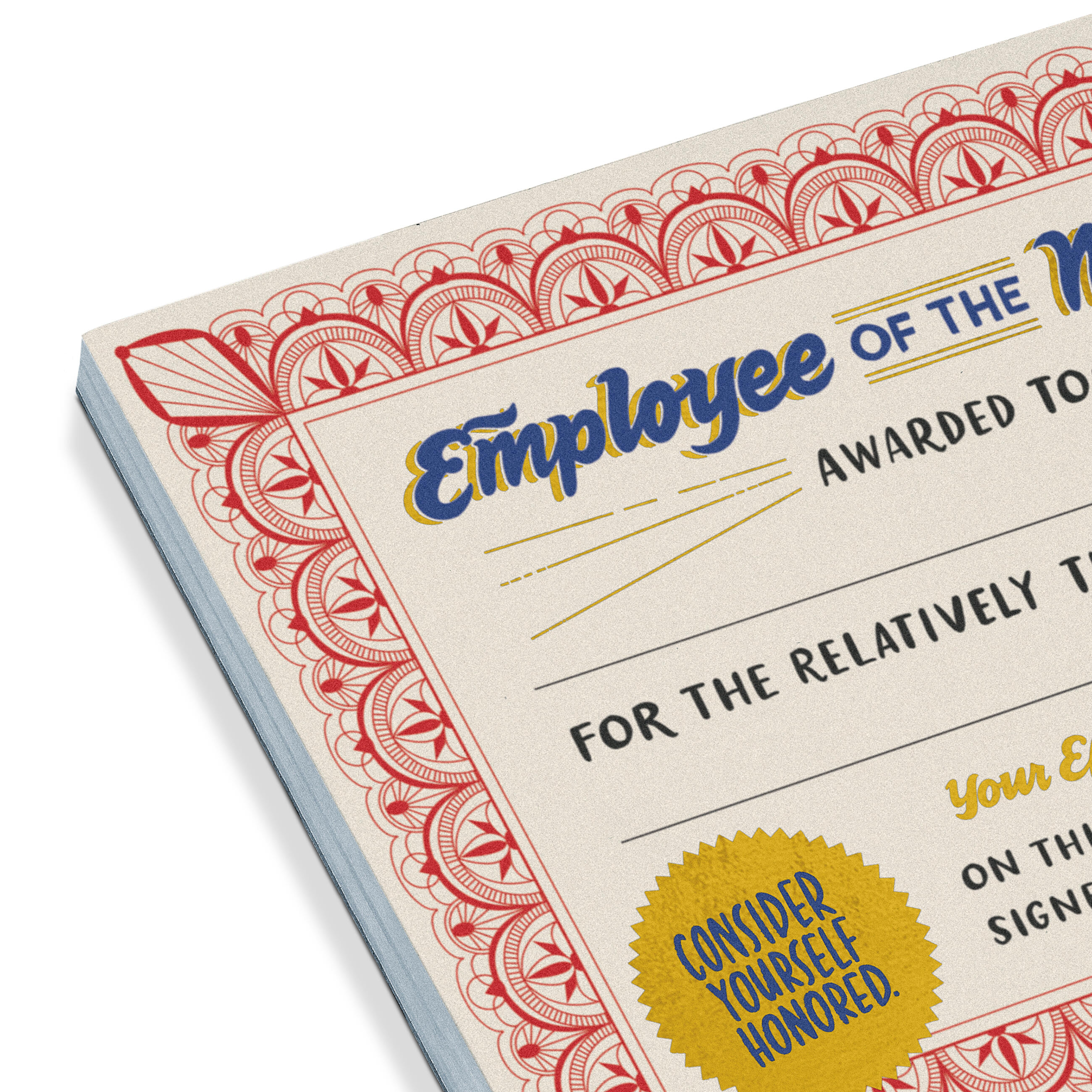 We’ve refreshed our Employee of the Moment Notepad with festive gold foil and even-more official-ish design! Award your coworkers for those acts of everyday valor that never get enough recognition. Replacing the copier paper. Sharing credit with others. Being cheerful, but not annoyingly perky. (That’s at LEAST as important as punctuality, isn’t it?)