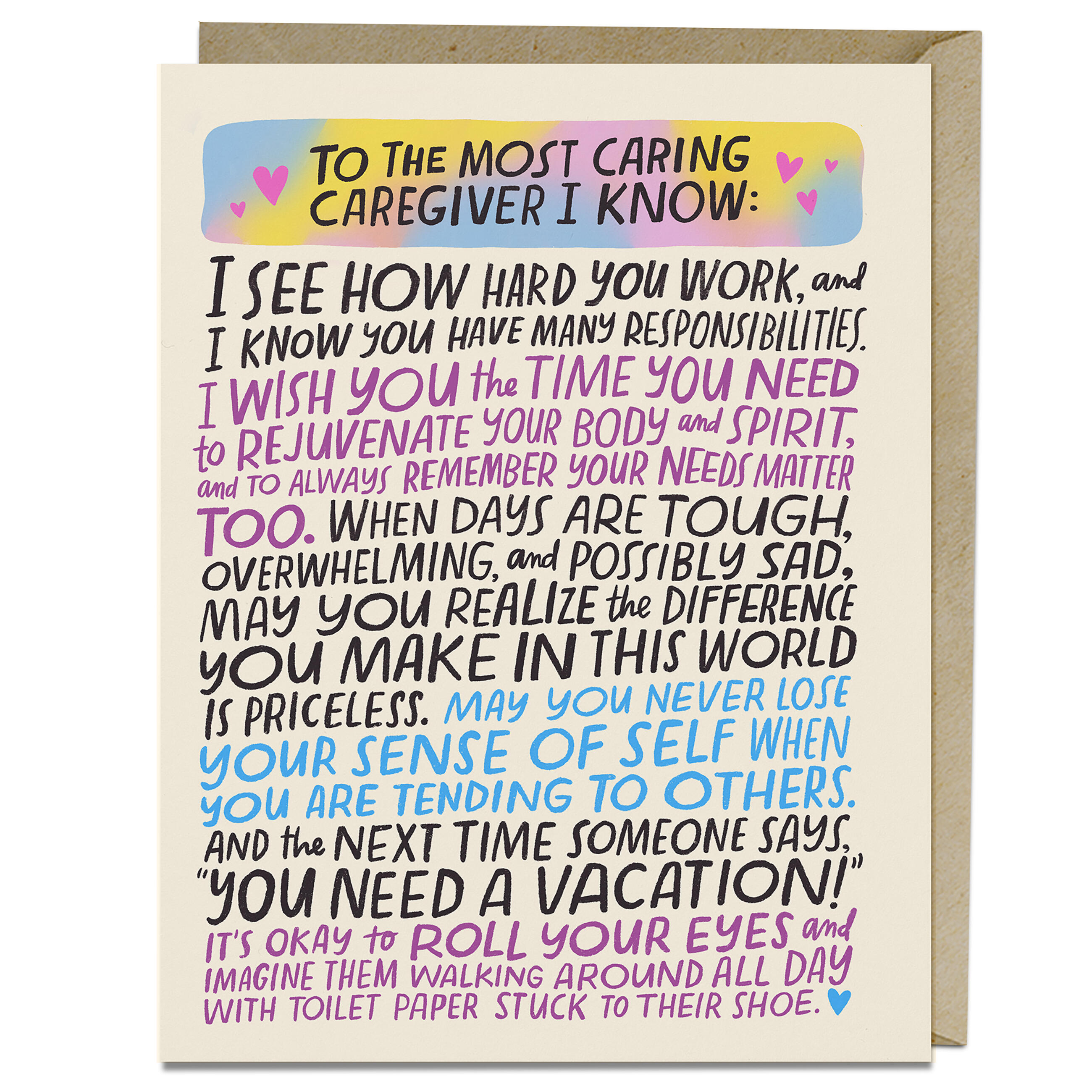 Caregivers work so hard, and often their dedication and commitment go unnoticed and unacknowledged. We wanted to make a card just for them, and we hope this card goes out into the world and reaches as many amazing caregivers as possible! Caregivers, we are thinking of you and WE LOVE YOU!