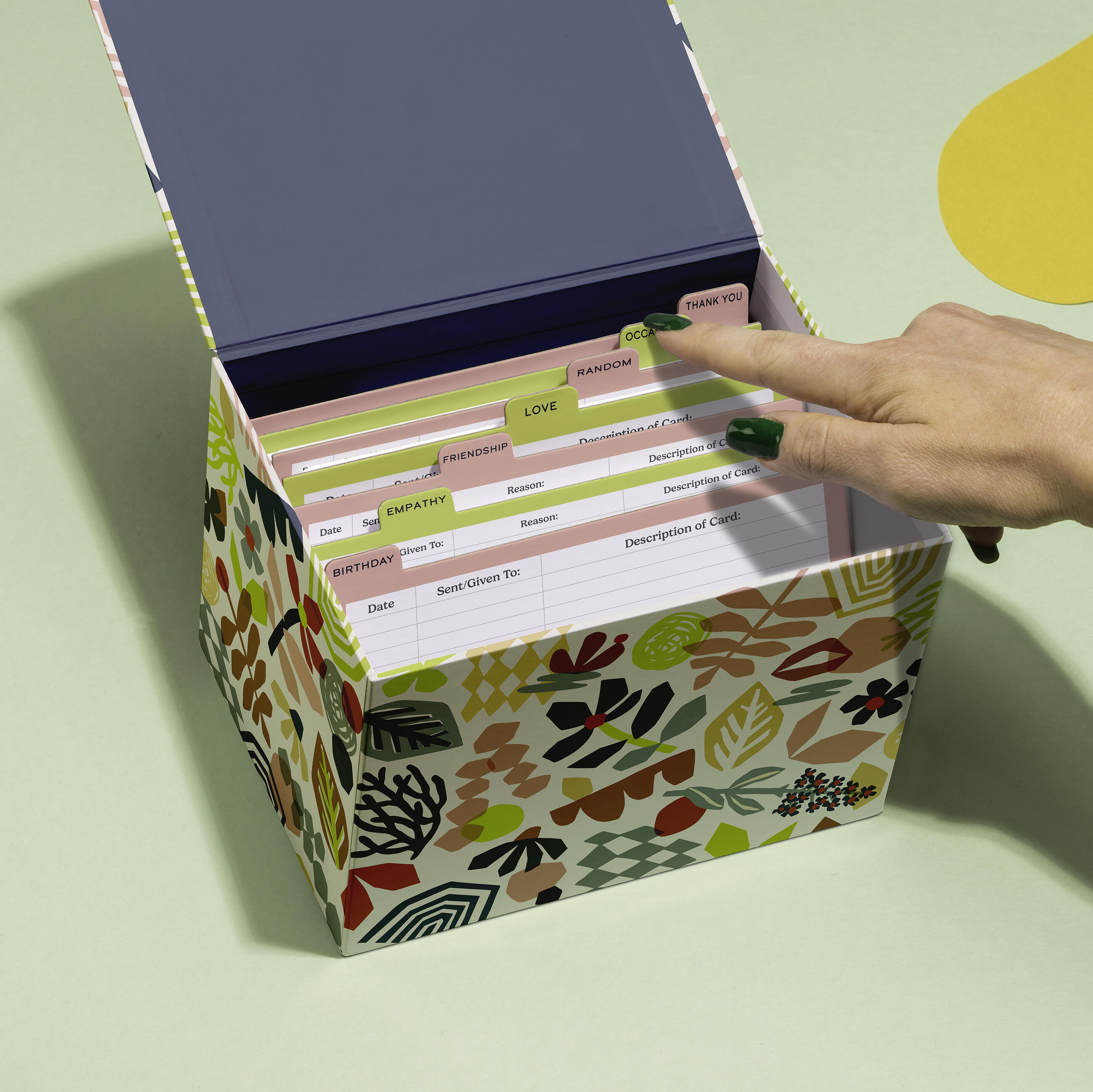 Hey, card lover! We created a box that’s like a file organizer for your cards, keeping ’em organized & safe from coffee spills & cat paws. Besides being cute and sturdy, it’s roomy enough for 60+ cards—and comes stocked with 6 EMF greeting cards! Plus it’s got stickers, tabbed dividers, and a calendar for important dates! OH YEAH, plus an address keeper, trackers to log cards you’ve sent, and tips for writing cards! Did we forget anything? Hmmmmmm… Well, it doesn’t come with a nice warm mug of tea. We thought it might spill.
