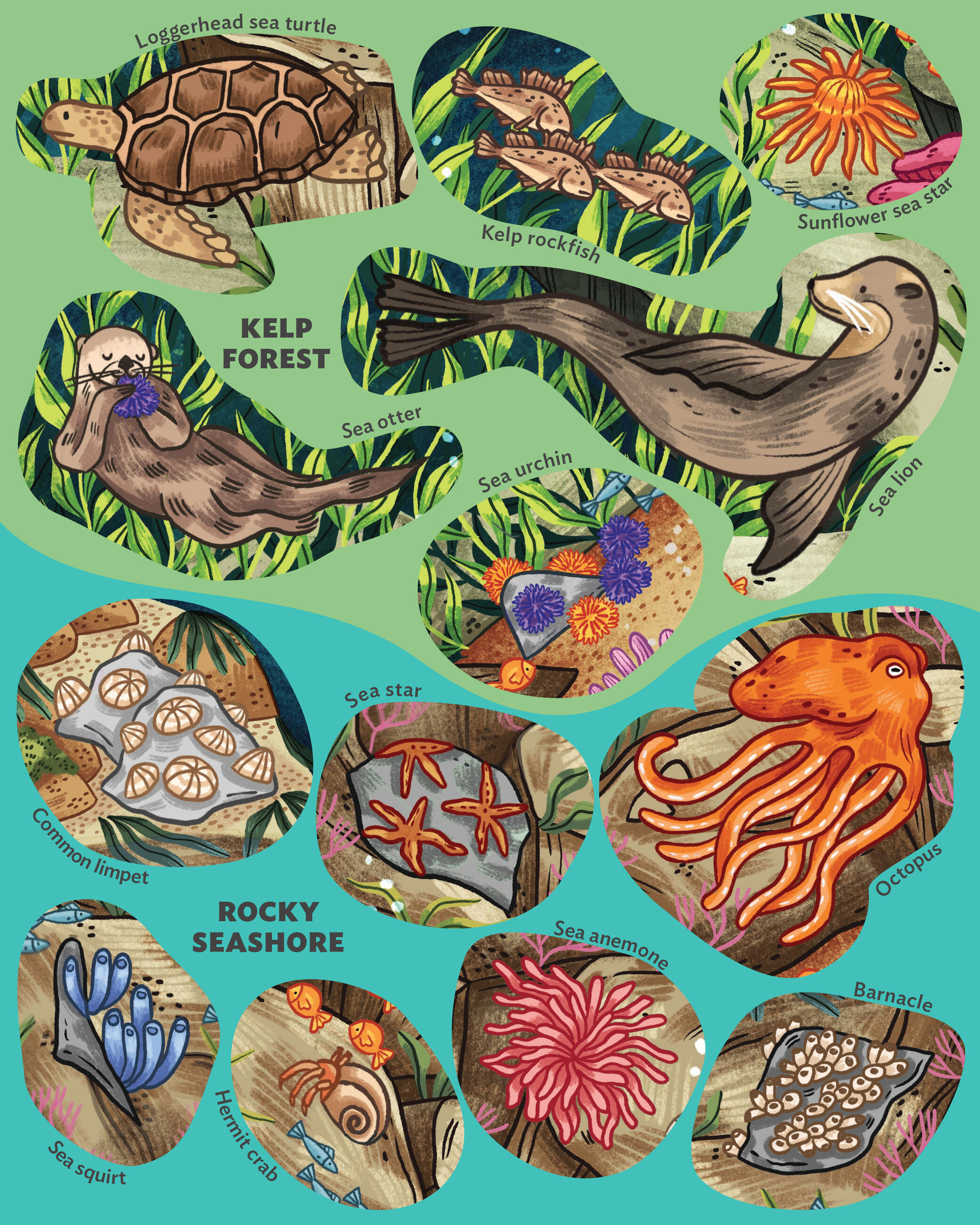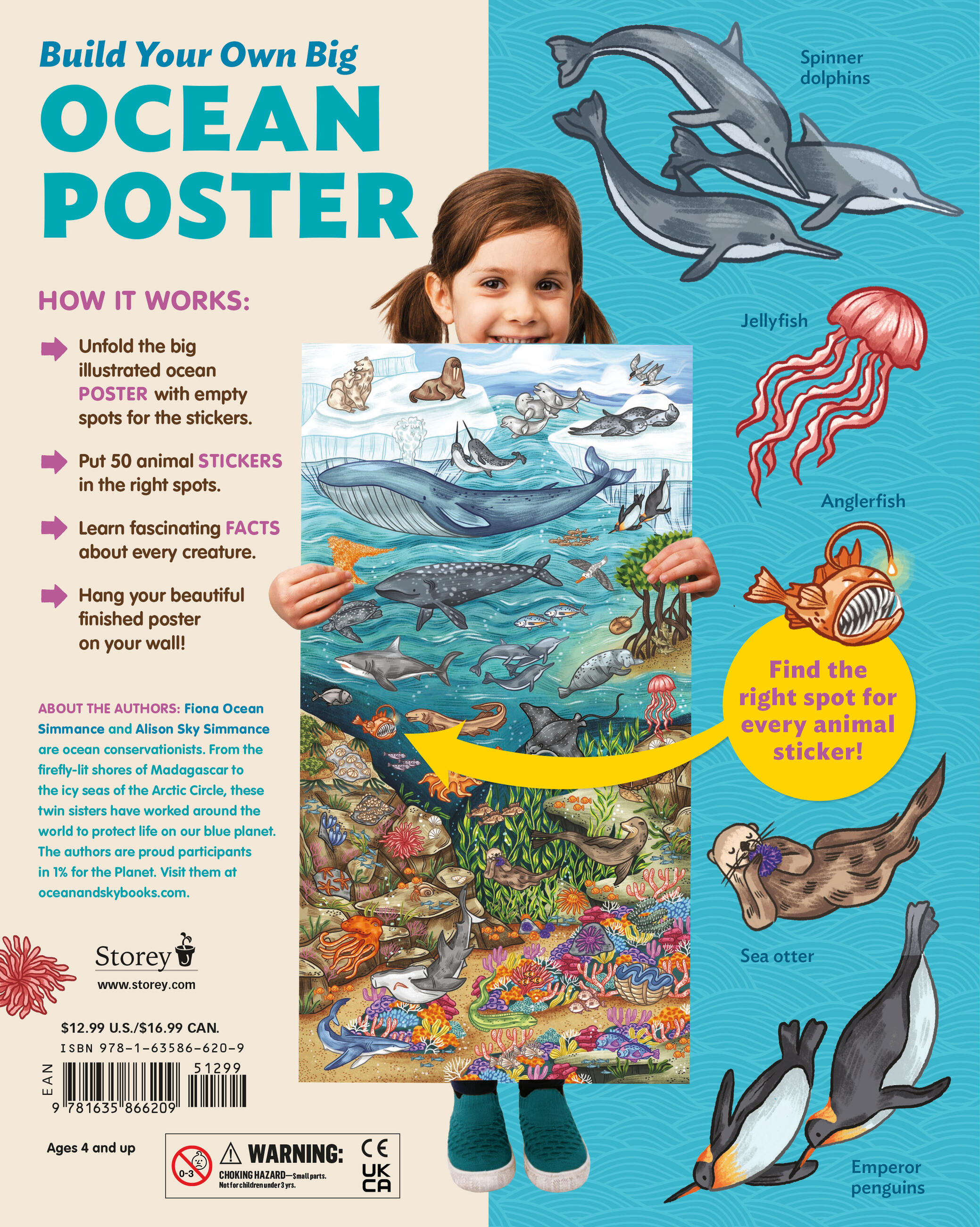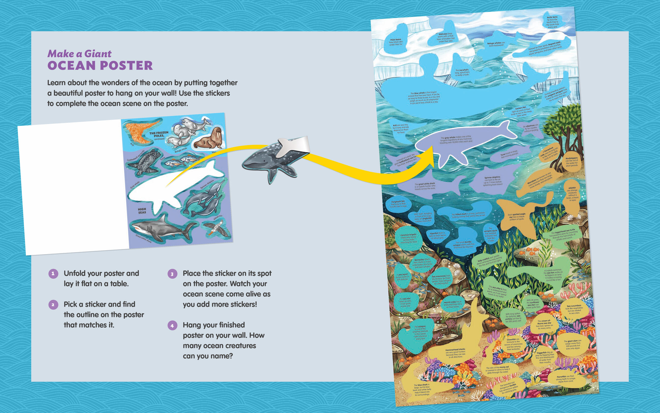 From those dwelling on the shore and in the air like polar bears, emperor penguins, sea otters, and albatross, to the swimmers like clownfish, moray eels, lionfish, hammerhead sharks, dumbo octopuses, and Beluga whales, to the deep sea bottom dwellers like hermit crabs, sea squirts, barnacles, and giant clams, kids will love following the clues to match the creature to its place on the poster. The completed poster, measuring 15 x 28 inches, makes a stunning piece of wall art that kids can feel proud to display.