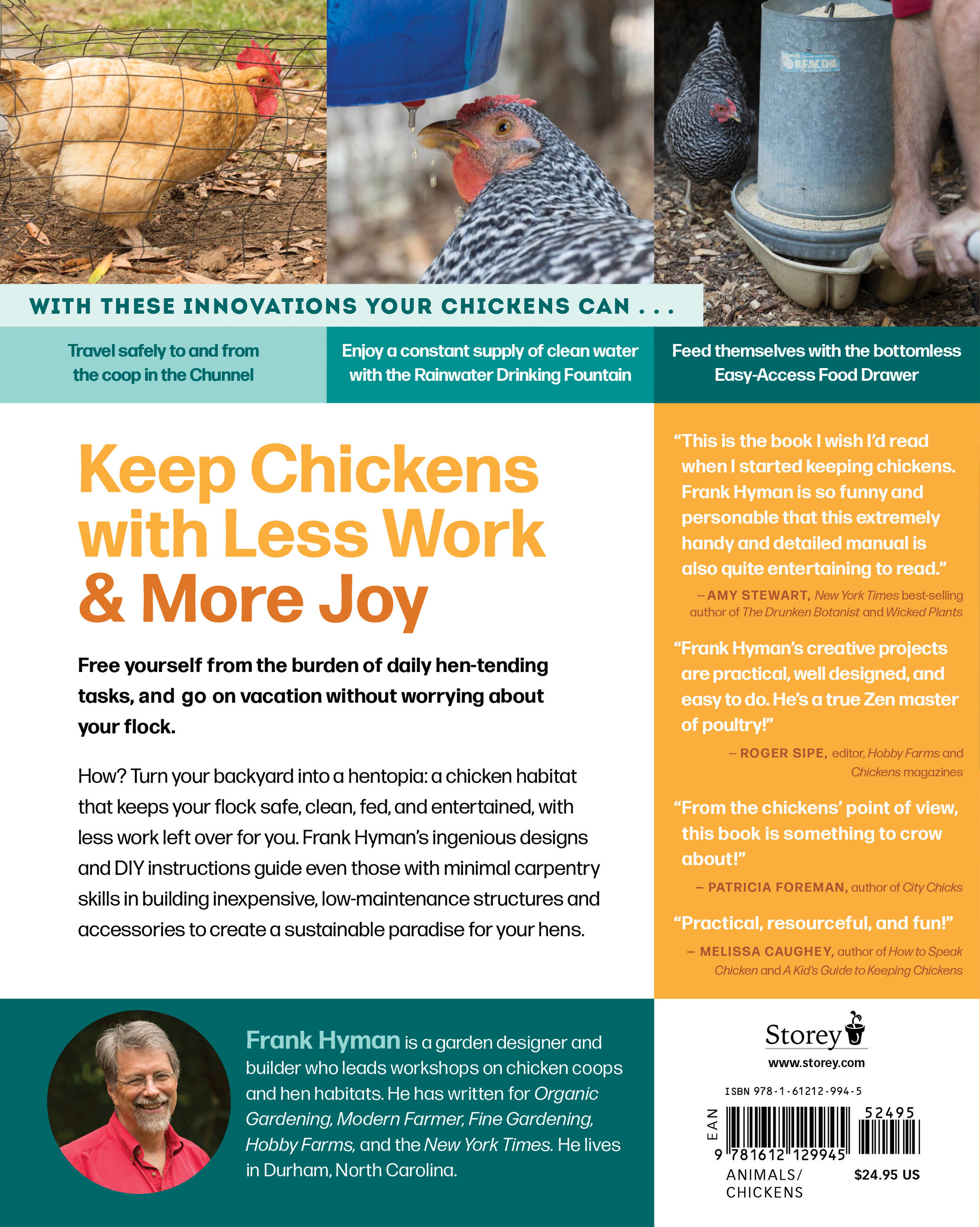 “This is the book I wish I'd read when I started keeping chickens. Frank Hyman is so funny and personable that he has managed to write an extremely handy and detailed chicken-keeping manual that is also quite entertaining to read. More importantly, he's lived the backyard chicken lifestyle and solved every imaginable problem using nothing more than a few ordinary tools and some ingenuity. Whether you're dreaming of keeping chickens or already manage a flock of your own, you will be inspired to take on one of these projects--and your chickens will thank you.” — Amy Stewart, NYT bestselling author of The Drunken Botanist and Wicked Plants