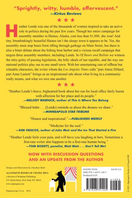 Heather Lende was one of the thousands of women inspired to take an active role in politics during the past few years. Though her entire campaign for assembly member in Haines, Alaska, cost less than $1,000, she won! And tiny, breathtakingly beautiful Haines isn’t the sleepy town it appears to be. Yes, the assembly must stop bears from rifling through garbage on Main Street, but there is also a bitter debate about the fishing boat harbor and a vicious recall campaign that targets three assembly members, including Lende. In Of Bears and Ballots we witness the nitty-gritty of passing legislation, the lofty ideals of our republic, and the way our national politics play out in one small town. With her entertaining cast of offbeat but relatable characters, the writer whom the Los Angeles Times calls “part Annie Dillard, part Anne Lamott” brings us an inspirational tale about what living in a community really means, and what we owe one another.