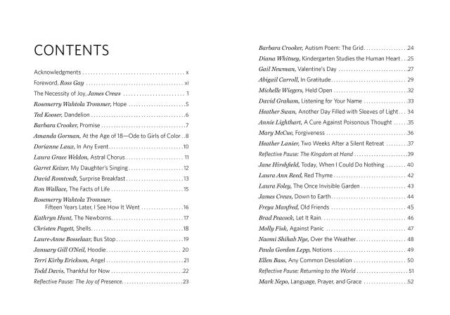 "Readers looking for poetic antidotes to today’s chronic anxiety and frenetic news cycle might enjoy turning to this new and highly readable collection. Spend some time with joy and gratitude through deeply felt work from some of poetry’s most trusted voices including inaugural poet Amanda Gorman, Joy Harjo, Tracy K. Smith, Ellen Bass, Ted Kooser, Naomi Shihab Nye, Jane Hirschfield, and others often featured in the pages of Orion. Interspersed with invitations to write and reflect, this book is designed for discussion and is classroom-ready." — Orion Magazine
