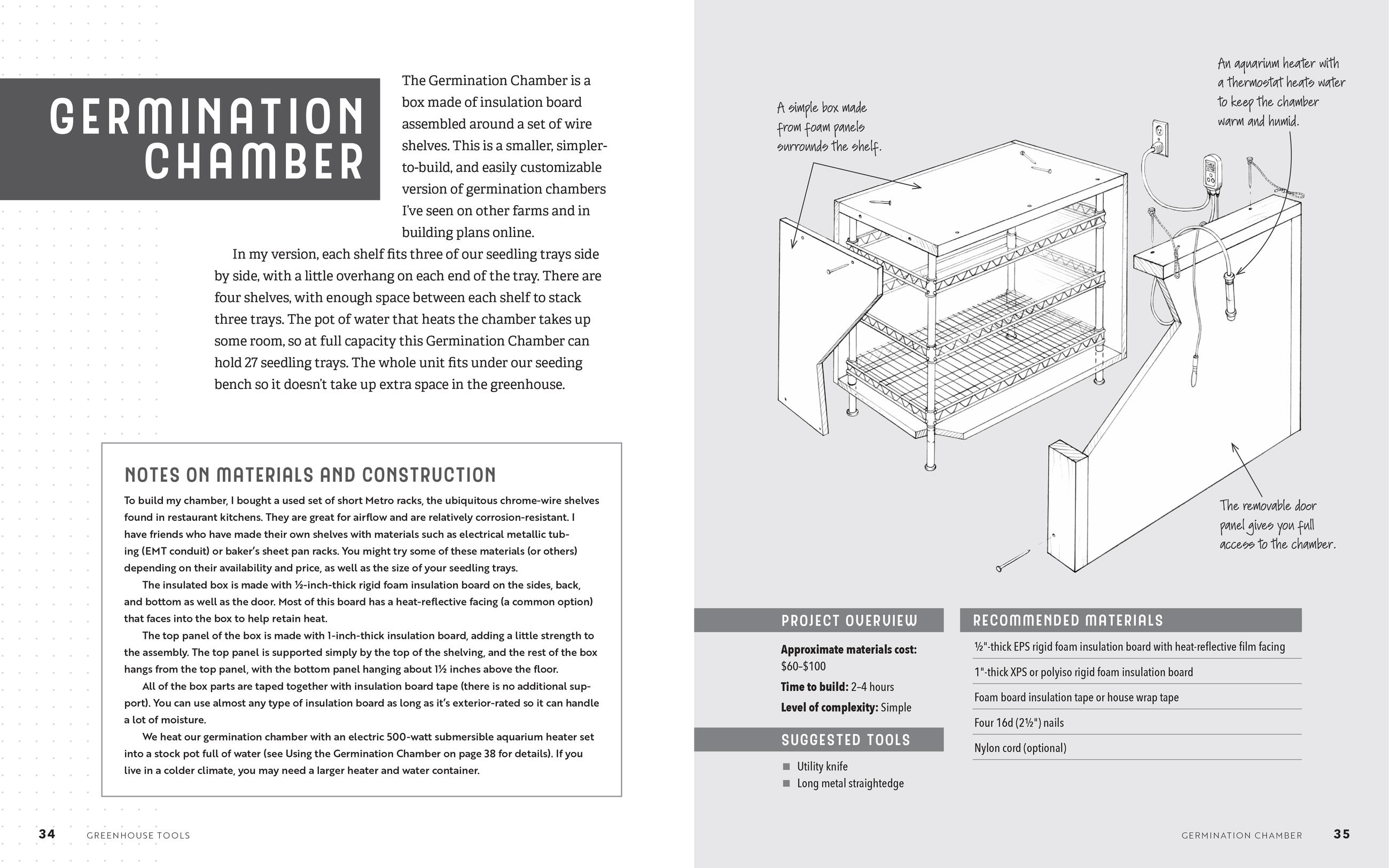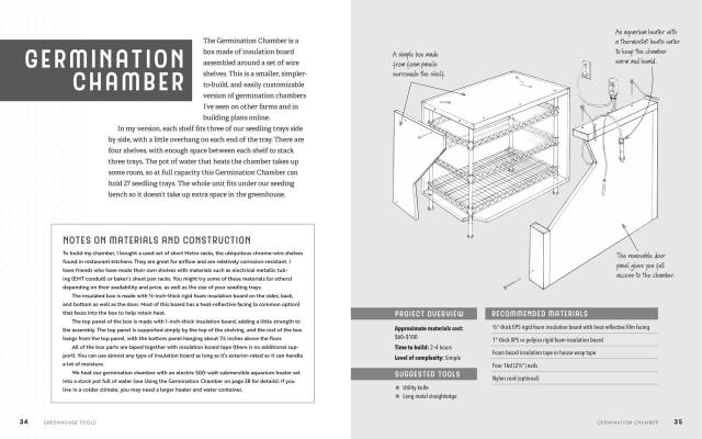 Volk begins with the basics, such as setting up a workshop and understanding design principles, mechanical principles, and materials properties, then presents plans for making 15 tools suited to small-farm tasks and processes. Each project includes an explanation of the tool’s purpose and use, as well as the time commitment, skill level, and equipment required to build it. Projects range from the super-simple (requiring a half-day to build) to the more complex, and include how-to photographs and illustrations with variations for customizing the finished implement. Along with instructions for building items such as simple seedling benches, a mini barrel washer, a DIY germination chamber, and a rolling pack table, Volk addresses systems design for farm efficiency, including how to design an effective drip irrigation system and how to set up spreadsheets for collecting important planning, planting, and market data.