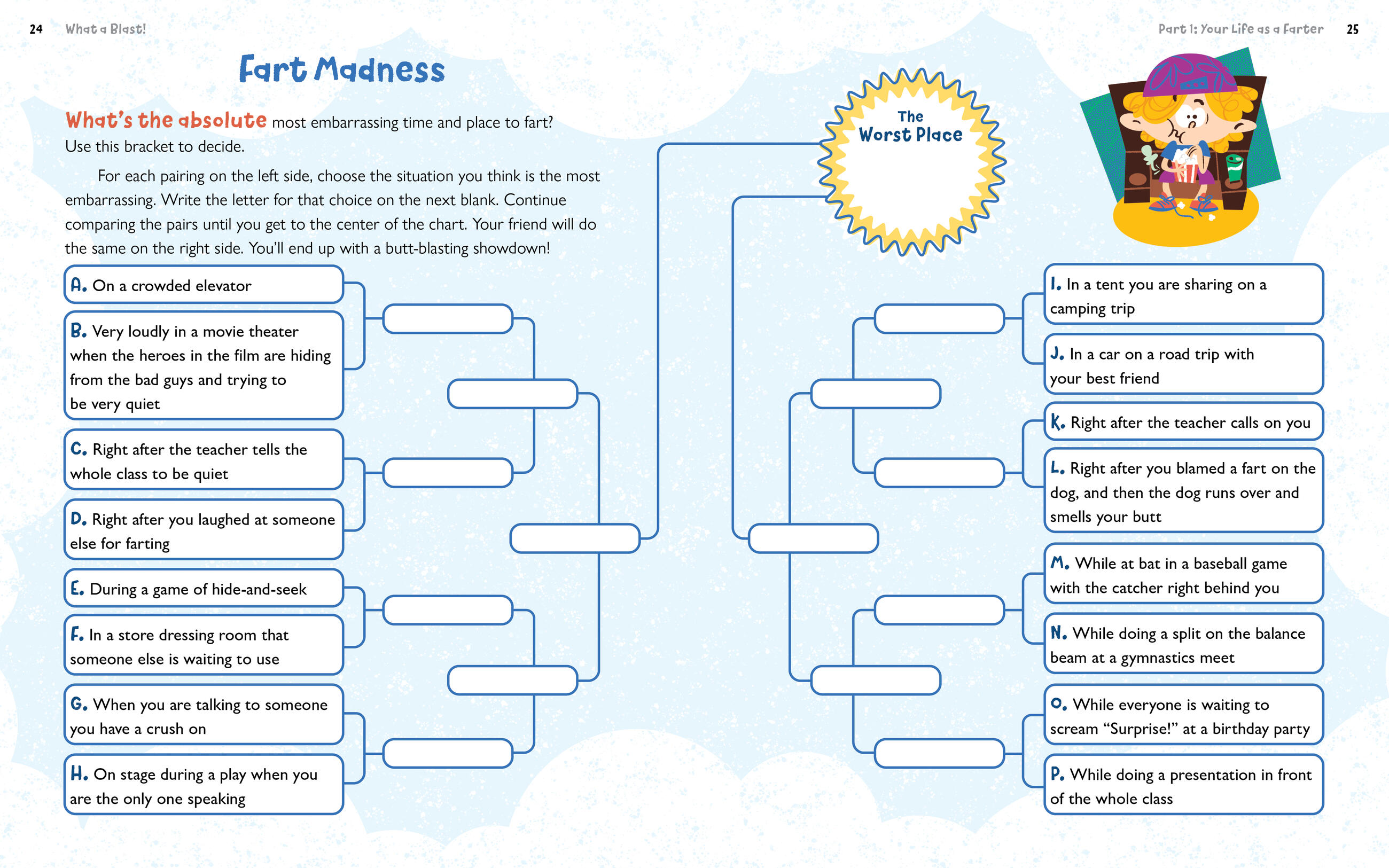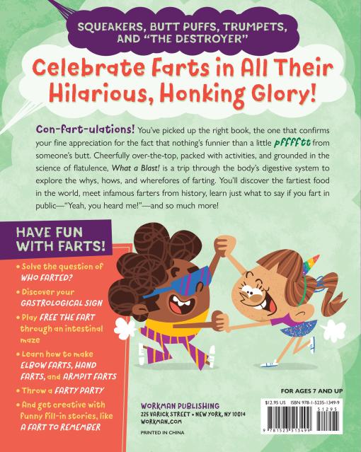 Con-fart-ulations! You’ve found the book that confirms your fine appreciation for the fact that nothings funnier than a little pfffftt from someone’s butt. Cheerfully over-the-top, packed with activities, and grounded in the science of flatulence, What a Blast! Is a trip through the body’s digestive system to explore the whys, hows, and wherefores of farting. You’ll discover the fartiest food in the world, meet infamous farters from history, learn just what to say if you fart in public—“Yeah, you heard me!—and so much more!