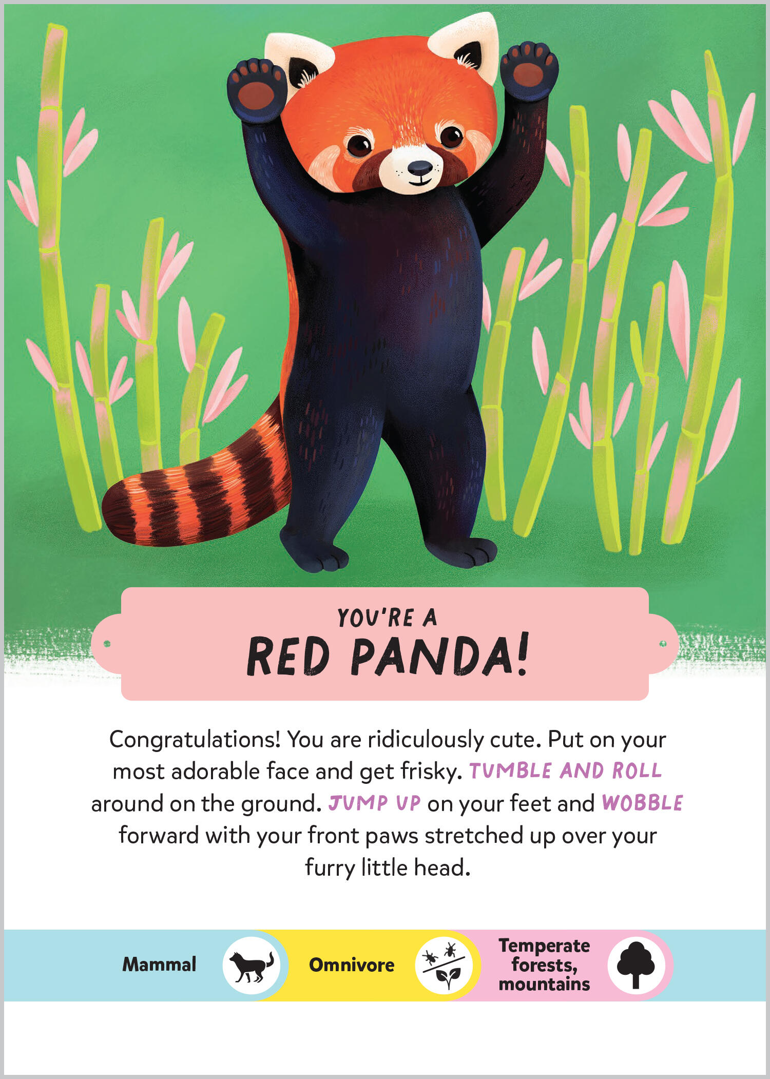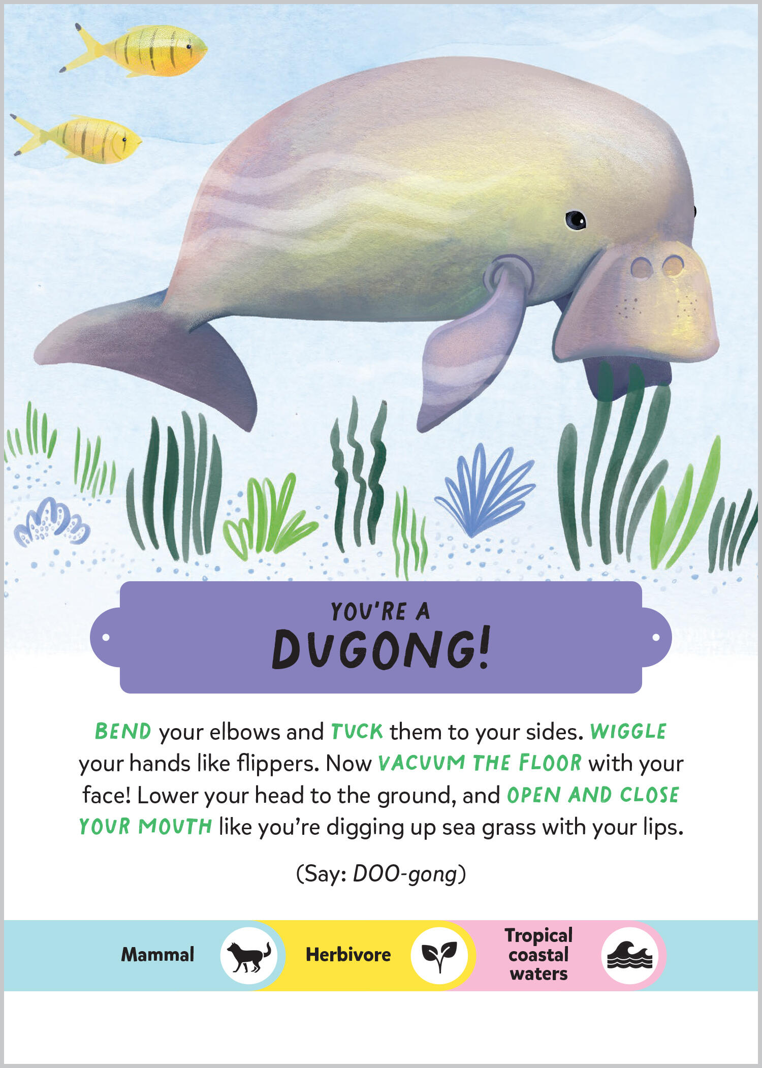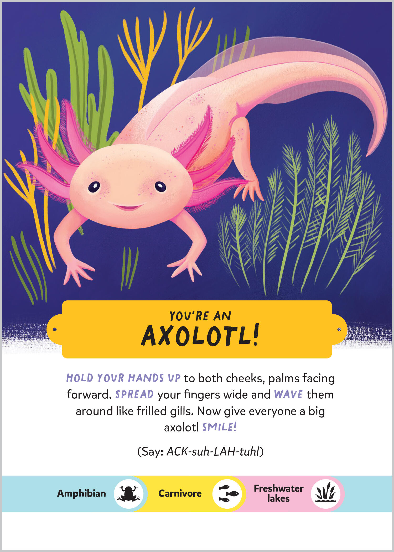 The charade activities in the card game Guess My Animal! introduce kids to the amazing and weird behaviors of 40 different animals: Roll into a ball like a frightened pangolin. Take a break and lie face down on the floor like a sunflower starfish. Hang around, slowly chewing, like a pygmy three-toed sloth. Crack shells on your belly like a sea otter. Smile and wave your frilled gills like an axolotl. Lie in wait, then lunge for your pray like a crocodile. Hunch up your shoulders, look down, and pretend to vomit on yourself like a nervous California condor!From the aye-aye to the colorful puffleg hummingbird and the golden poison frog, every animal is featured on its own colorfully illustrated card along with simple instructions on how to act out one aspect of that animal’s distinctive behavior and challenge the other players to identify the animal. The deck is accompanied by instructions for beginner, middle level, and advanced players, a poster showing all of the 40 featured animals, and a booklet with more interesting information about each animal. This creative play card game makes learning fun and engaging for kids ages 6 and up, along with their adults.