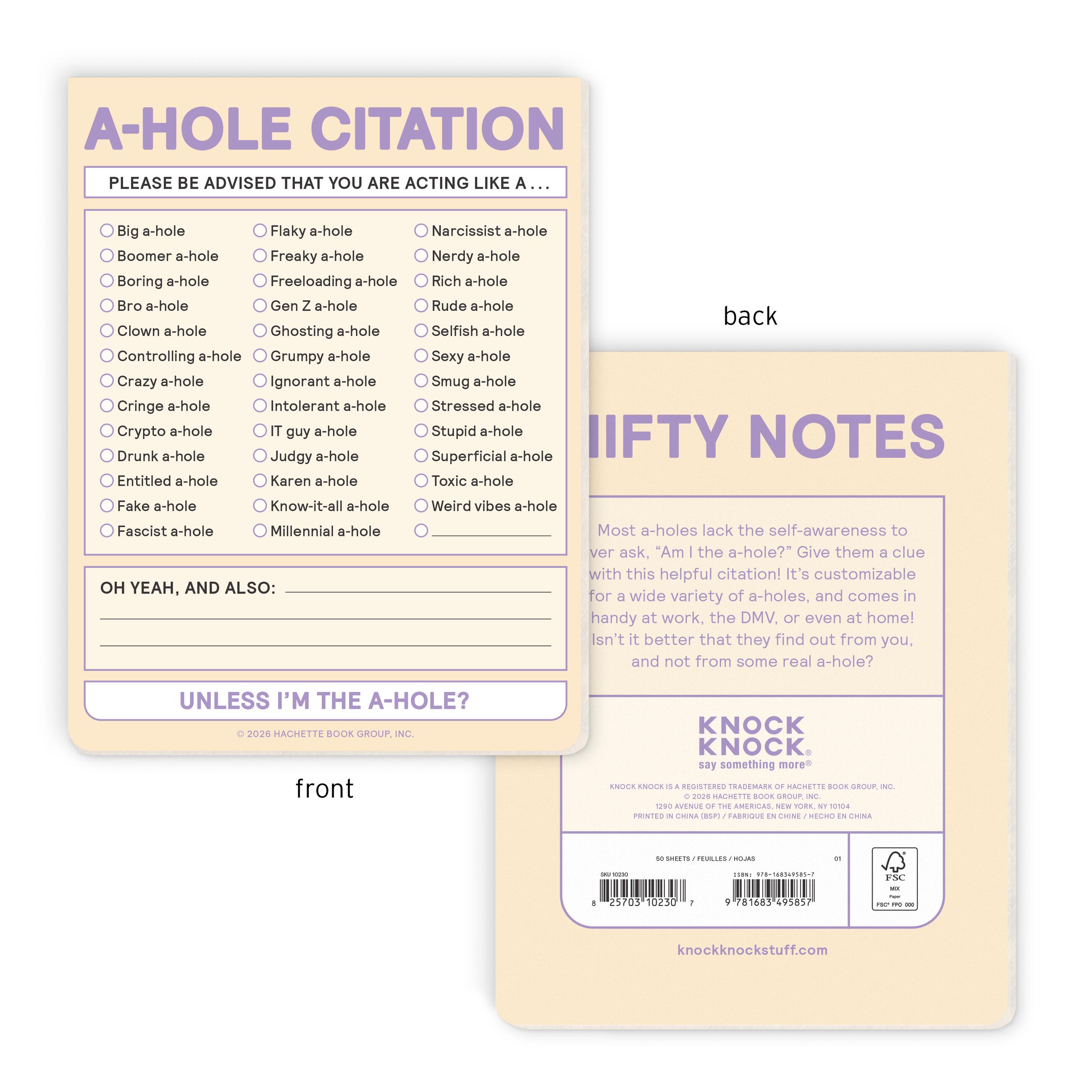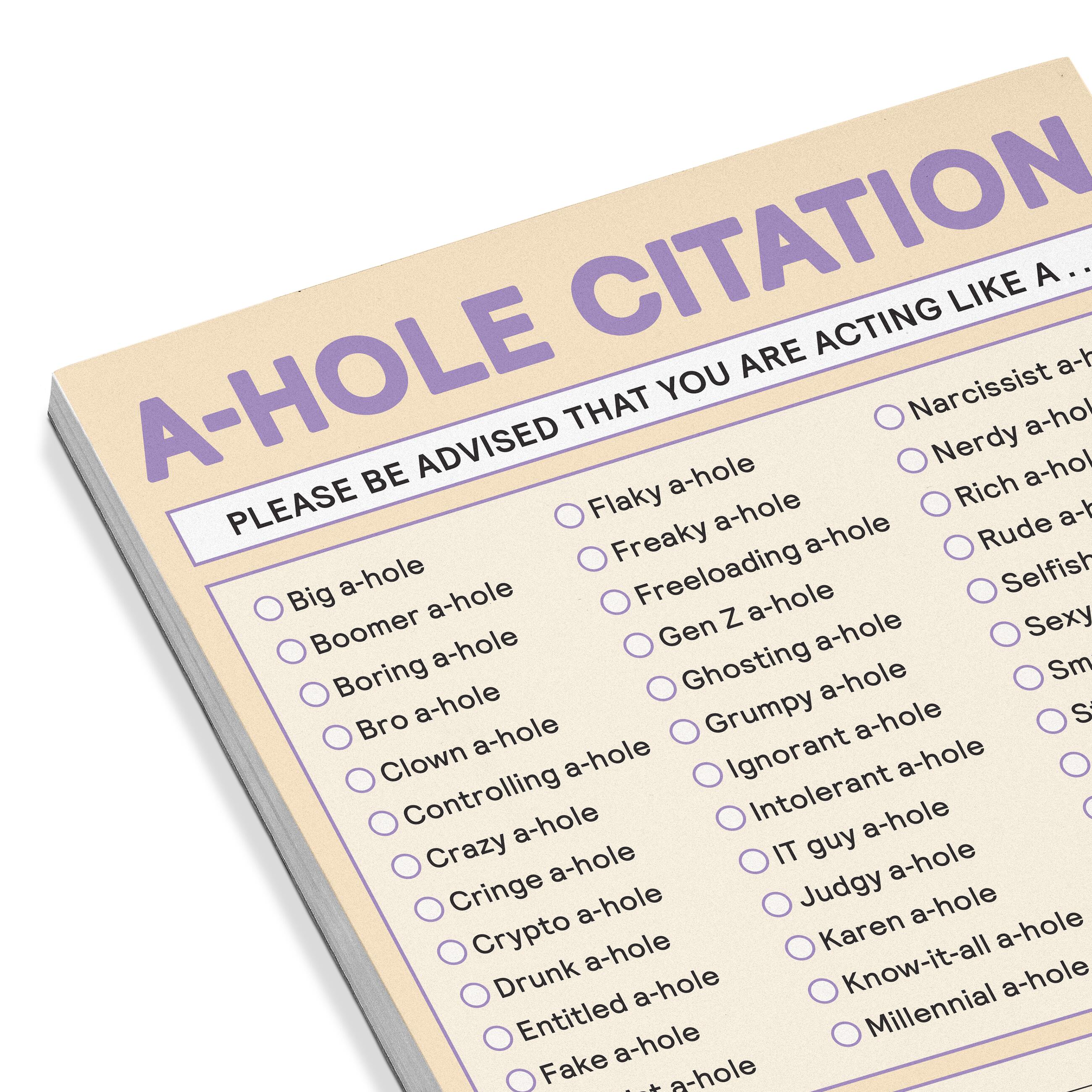 A-HOLE CITATION alerts someone on the spot when they are exhibiting real ass-holey-ness behaviors! Whether it’s family members, friends, or strangers, this little pad helps get the point across. Laugh-out-loud checkbox options speak to the tenor of our times and convey the nuances of exasperation in hilarious specificity—with extra room for personalization.