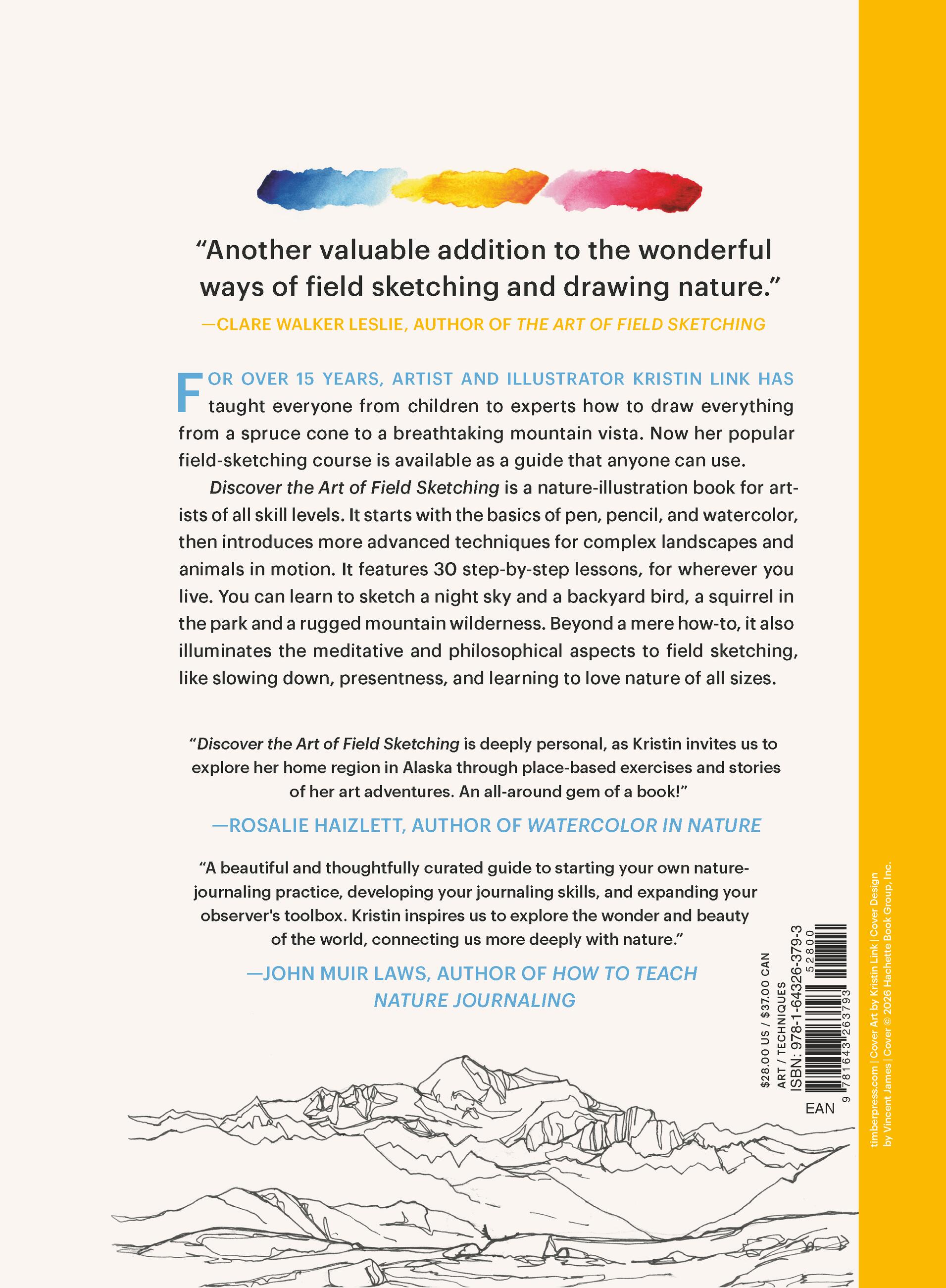 Discover the Art of Field Sketching is a nature illustration book for artists of all skill levels. It starts with the basics of pen, pencil, and watercolor, then introduces more advanced techniques for complex landscapes and animals in motion. It features visual subject matter for wherever you live: you can learn to sketch a night sky, a backyard bird, or a squirrel in the park as well as a rugged mountain wilderness. The book includes 30 step-by-step lessons, and many more inspiring examples of finished products. It also focuses on the meditative and philosophical aspects to field sketching, like slowing down, presentness, and learning to love nature of all sizes.