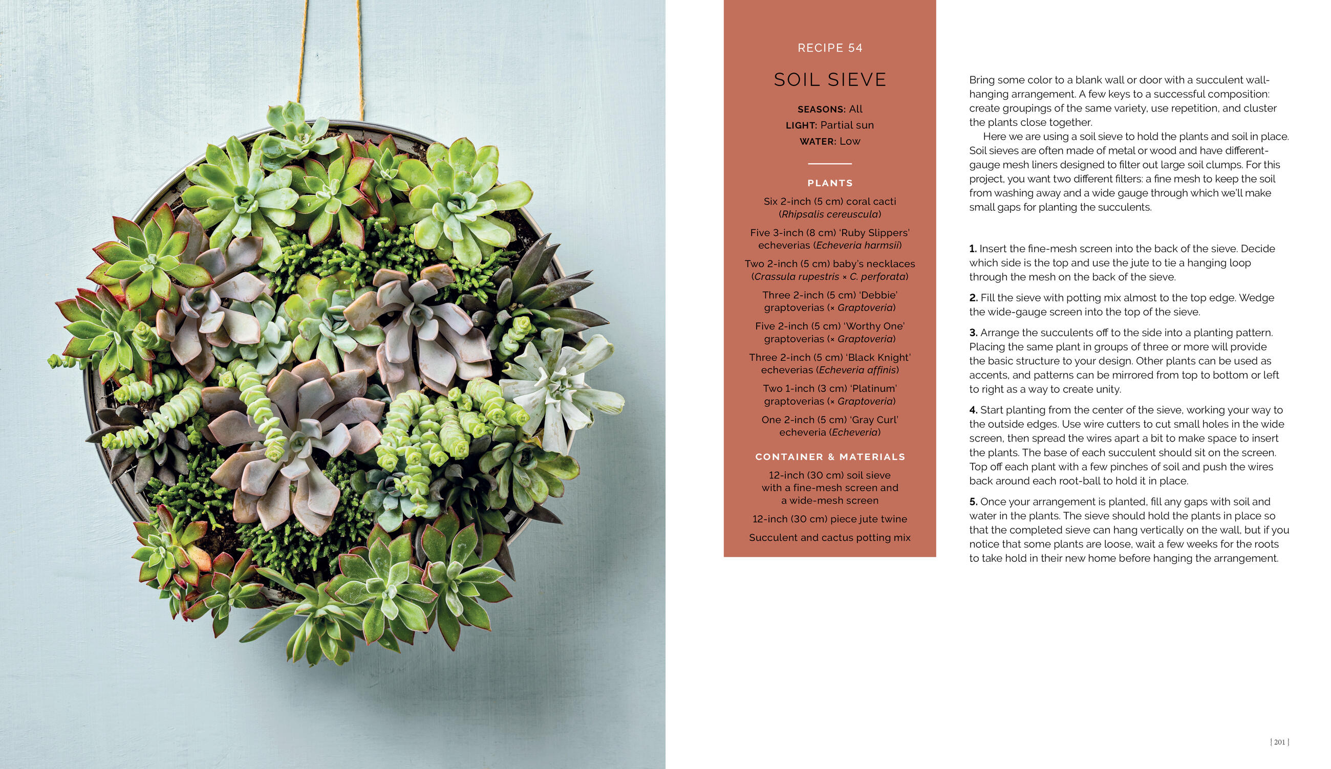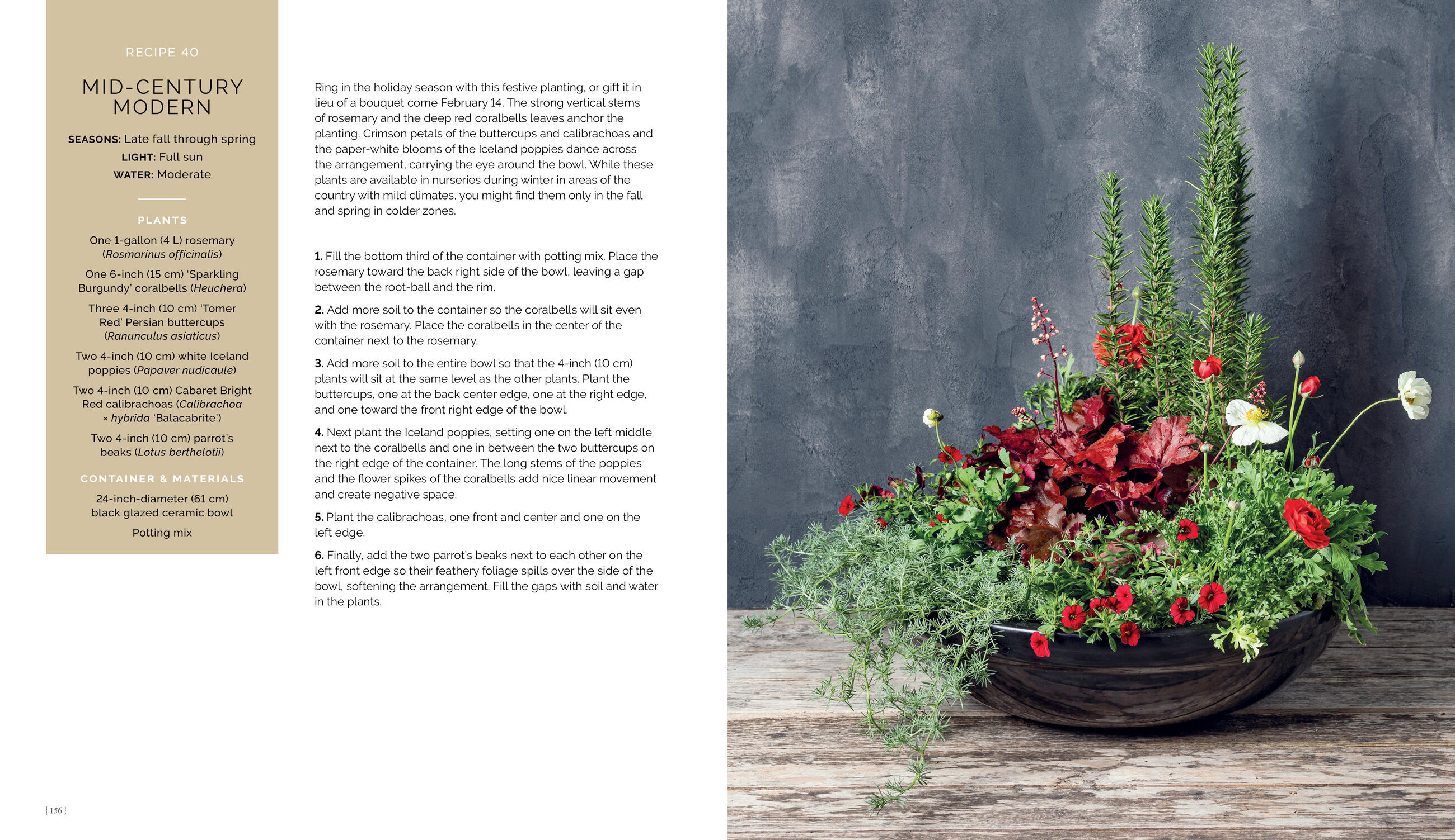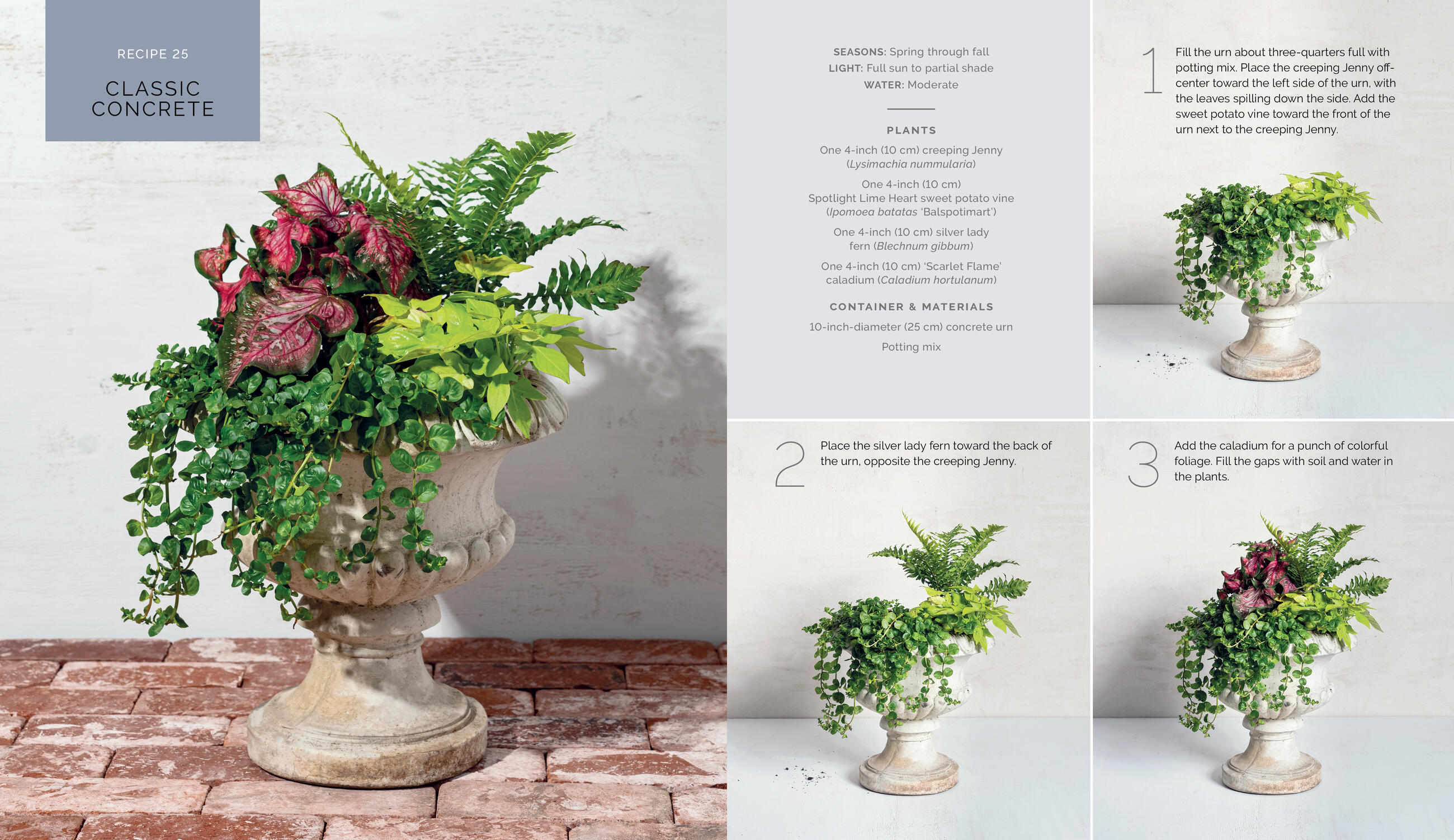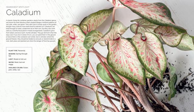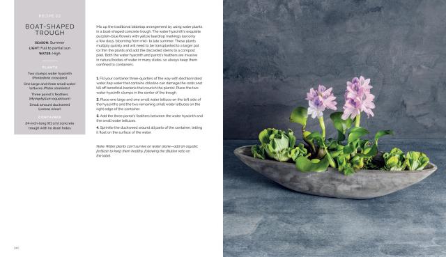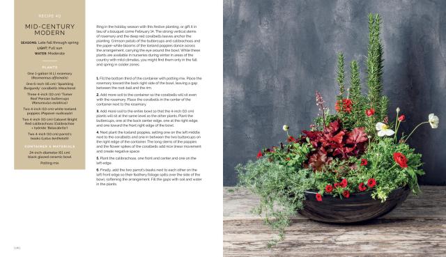 And recreating these stunning designs couldn’t be simpler! Each recipe includes a detailed ingredients list and step-by-step instructions, along with hundreds of photos showing where and how to place each plant. Also included is foundational information on planting techniques, care instructions, choosing the right container, as well as plant spotlights highlighting foolproof options for all climates and seasons, from spring bulbs to evergreens.