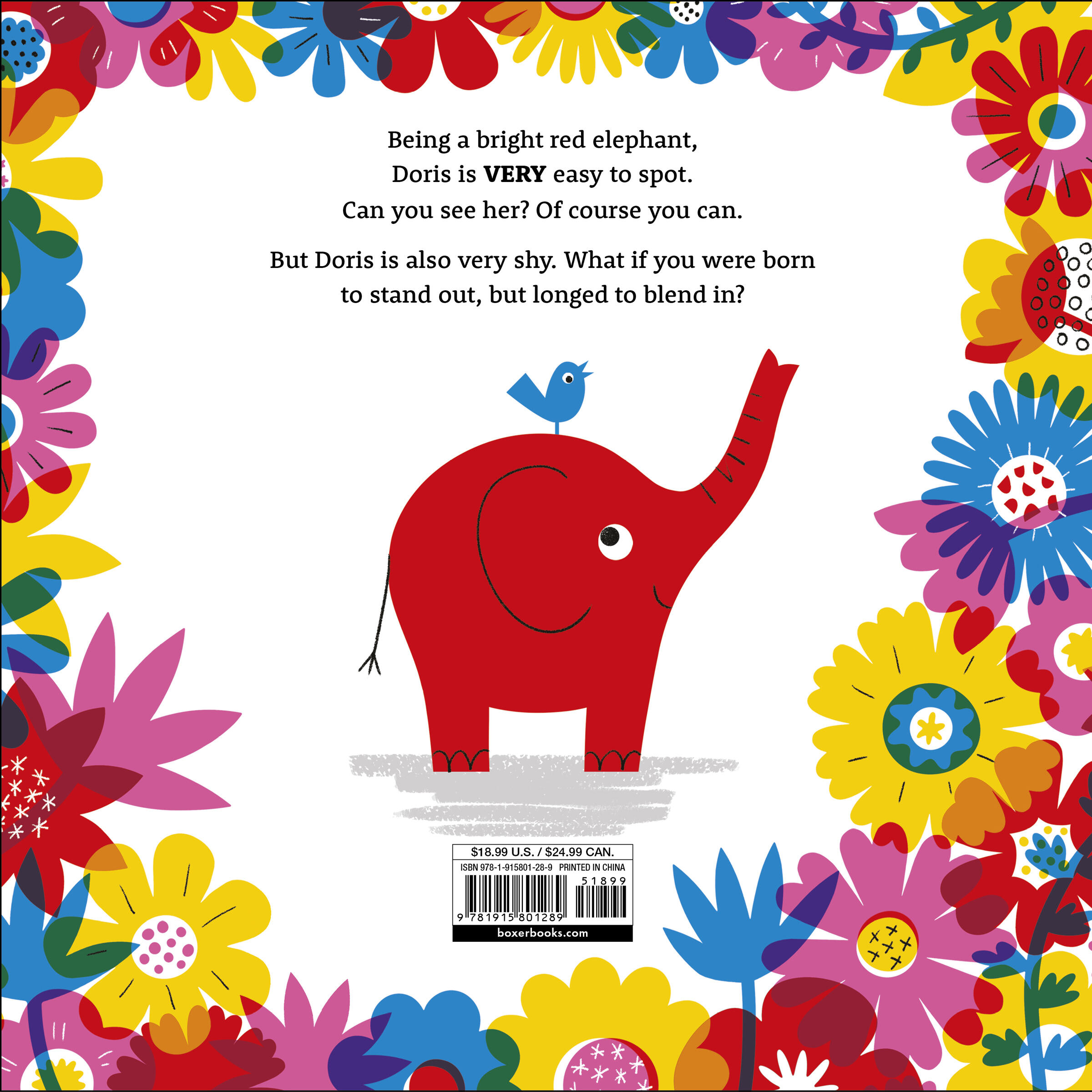 Doris does NOT like to stand out. But as a red elephant, no matter where she hides, she is easily spotted. Whether hiding behind a flock of birds, within a bed of flowers, or among a school of fish, she can be seen. Can she find a way to build her confidence and embrace her colorful self?