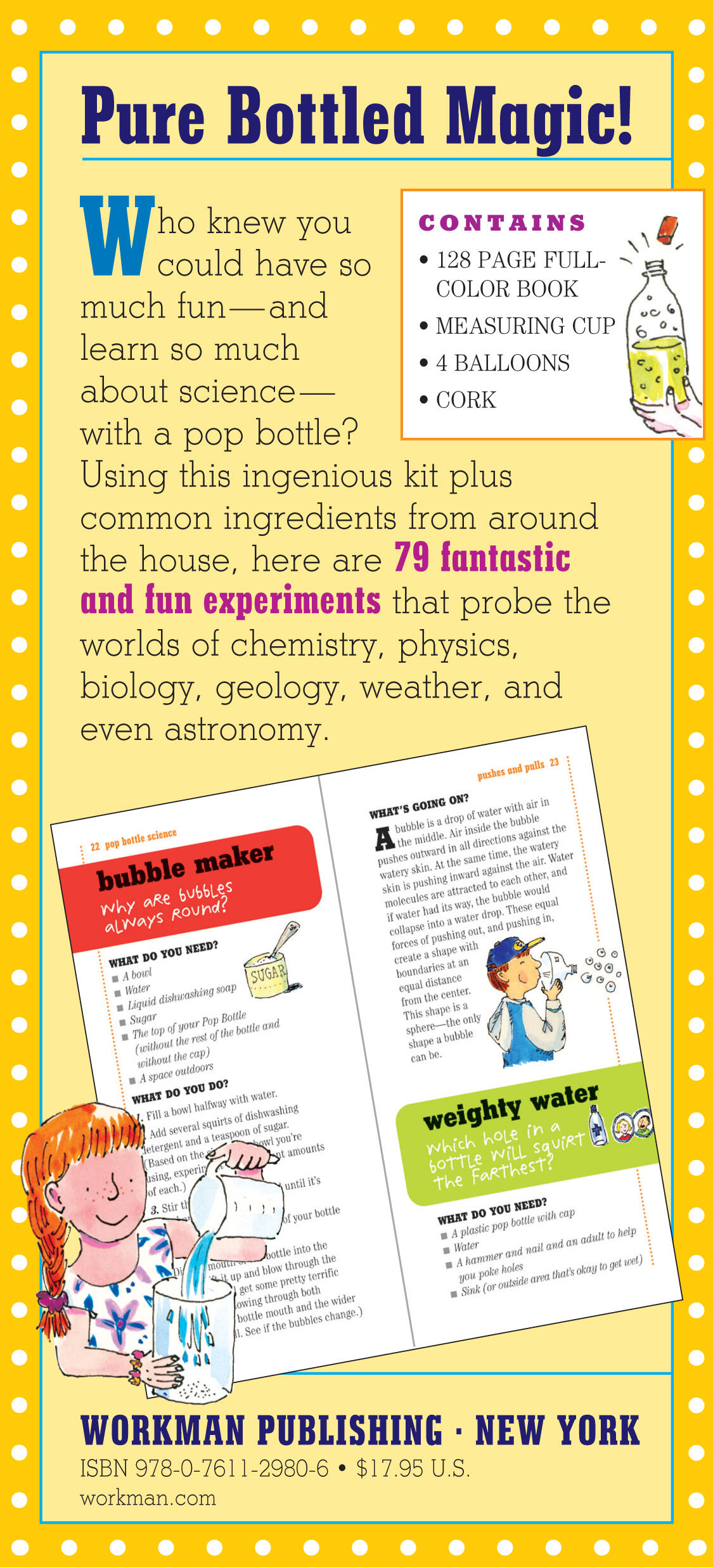 In the kit is a lively, fully illustrated 96-page guide to astonishing and easy science experiments to perform at home with materials you have on hand. Each experiment begins with a challenge and ends with an explanation of the scientific principles involved. Kids can design a volcano and watch it erupt. Create a tornado-maker and see how twisters work. Make quicksand–is it solid or liquid? Observe photosynthesis in action. Simulate Jupiter’s giant red spot, investigate buoyancy, demonstrate inertia, and discover the Bernoulli principle–which allows planes to fly. Plus, turn the bottle into a barometer, a thermometer, walkie-talkie, trombone, compass–or groovy lava lamp.