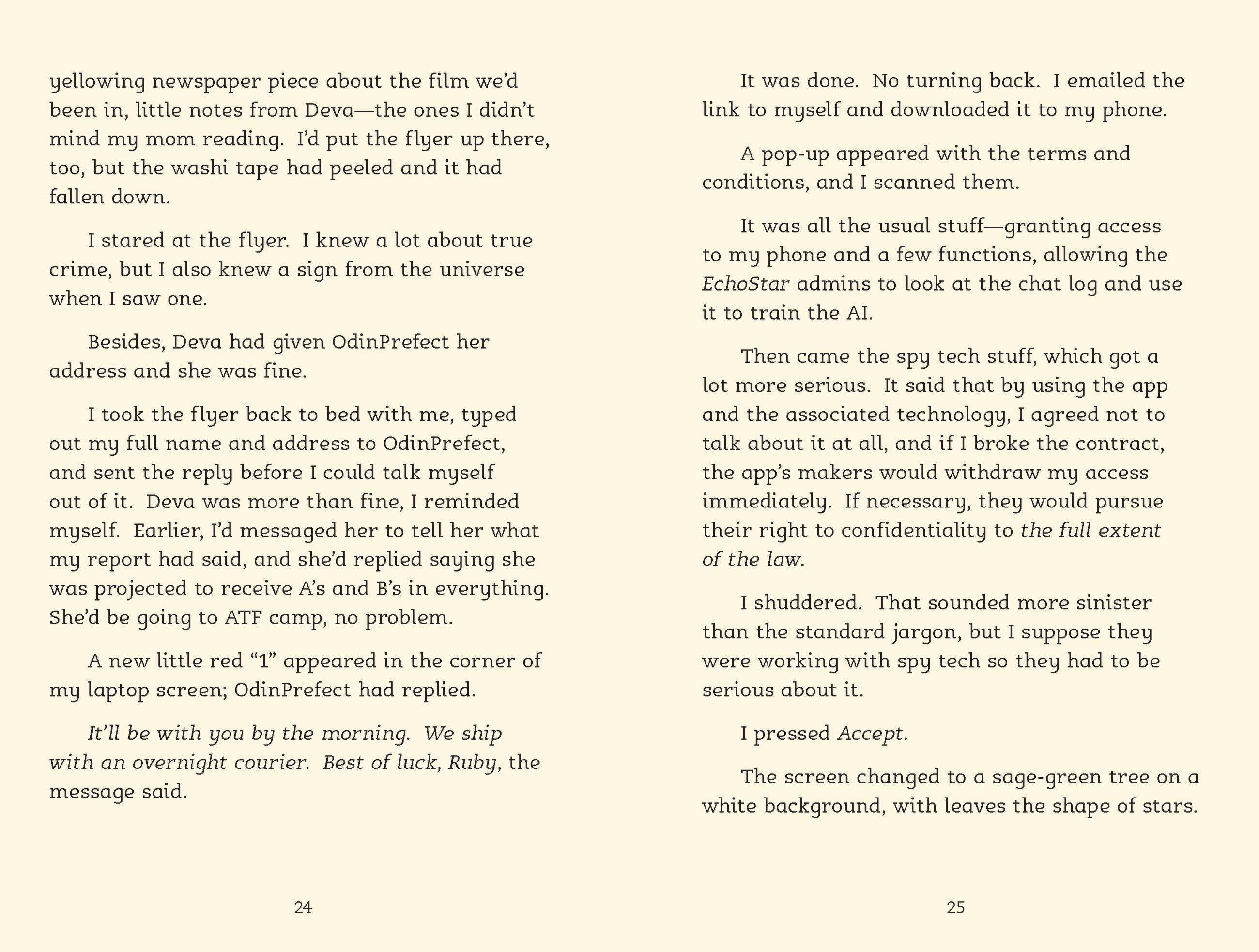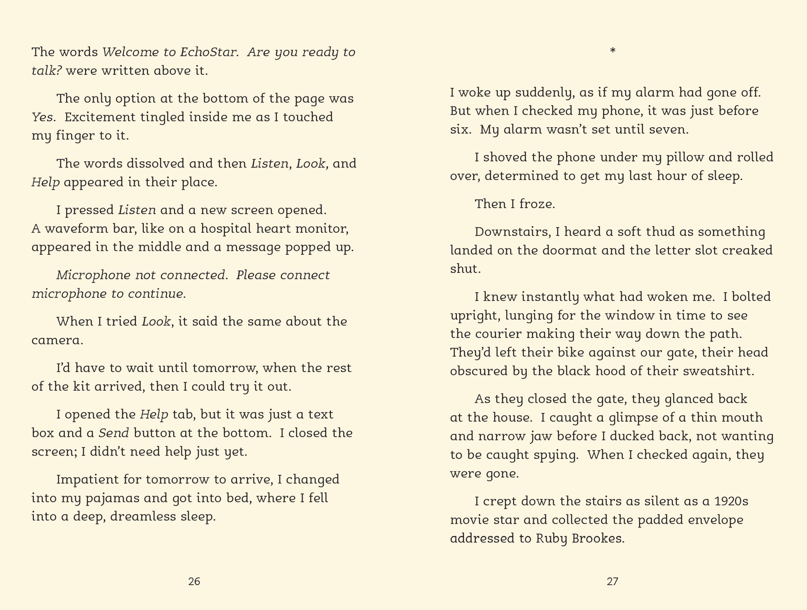 Ruby and her best friend Deva have won free places at the Ash Tree Foundation Performing Arts Camp over the summer. There’s just one problem: they won’t be able to attend unless their grades seriously improve. When Deva suddenly starts getting high marks in all their subjects, a confused and hurt Ruby feels left behind. Then she finds out Deva’s success is due to EchoStar, a new app that’s helping her get ahead.