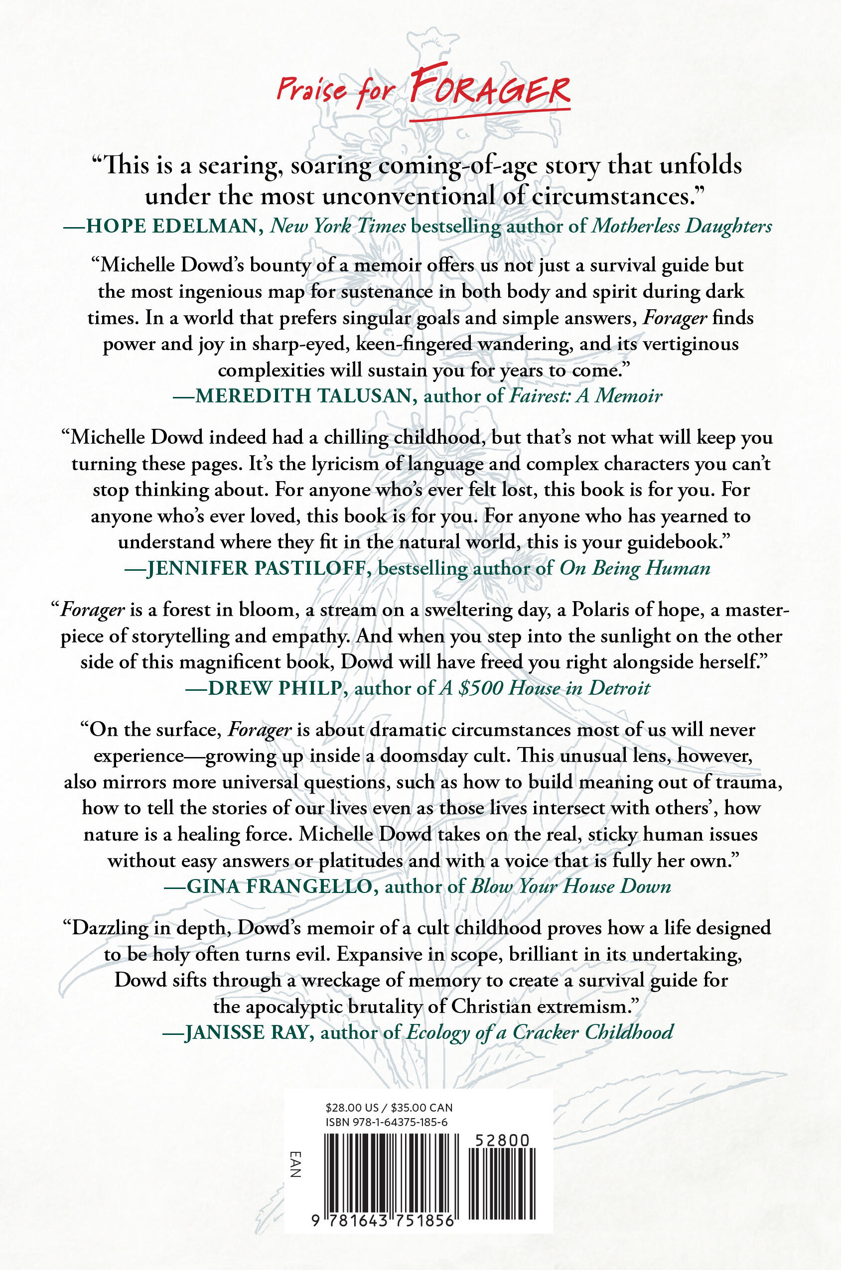 "In chapters centered on the edible plants she was forced to forage to avoid starvation, Dowd (now an academic and journalist) charts her path to freedom with remarkable clarity."Kirkus Reviews "Beautifully delicate illustrations and foraging tips also keep things bright. An inspiring and insightful tale of resilience in the face of adversity, this book is hard to put down.”—Booklist"Listen to me: get this book in your hands now and prepare to lose a couple nights of sleep because you won’t be able to put it down. Michelle Dowd indeed had a chilling childhood, but that’s not what will keep you turning these pages. It’s the lyricism of language and complex characters you can’t stop thinking about it. For anyone who’s ever felt lost, this book is for you. For anyone who’s ever loved, this book is for you. For anyone who has yearned to understand where they fit in the natural world, this is your guidebook."—Jennifer Pastiloff, bestselling author of On Being Human "On the surface, Forager is about dramatic circumstances most of us will never experience--growing up inside a doomsday cult. This unusual lens, however, also mirrors more universal questions, such as how to build meaning out of trauma, how to tell the stories of our lives even as those lives intersect with others', how nature is a healing force even as we participate in its destruction. Michelle Dowd takes on the real, sticky, human issues without easy answers or platitudes and with a voice that is fully her own."—Gina Frangello, author of Blow Your House Down "Dazzling in depth, chilling in its revelations, Michelle Dowd’s memoir of a cult childhood proves how a life designed to be holy often turns evil. Dowd forages childhood experiences in an effort to come to terms with a family’s errant divinity—a fanaticism that leads to religious violence. What saves her, ultimately, is her biblical relationship with the natural world. Expansive in scope, brilliant in its undertaking, Dowd sifts through a wreckage of memory to create a survival guide for the apocalyptic brutality of Christian extremism."—Janisse Ray, author of Ecology of a Cracker Childhood "Michelle Dowd's bounty of a memoir offers us not just a survival guide, but the most ingenious map for sustenance in both body and spirit during dark times. In a world that prefers singular goals and simple answers, Forager finds power and joy in sharp-eyed, keen-fingered wandering, and its vertiginous complexities will sustain you for years to come."—Meredith Talusan, author of Fairest: A Memoir "No matter who you are or where you’re from, Dowd will guide you by the hand into her beautiful and heartbreaking family forest to show with heroic vulnerability how you might glean life from both the flowers and the thorns of her own. This isn’t just a field guide for surviving a family cult, but a universal path through the dark and glorious wood of life itself. Forager is a forest in bloom, a stream on a sweltering day, a Polaris of hope, a masterpiece of storytelling and empathy. And when you step into the sunlight on the other side of this magnificent book, Dowd will have freed you right alongside herself."—Drew Philp, author of A $500 House in Detroit