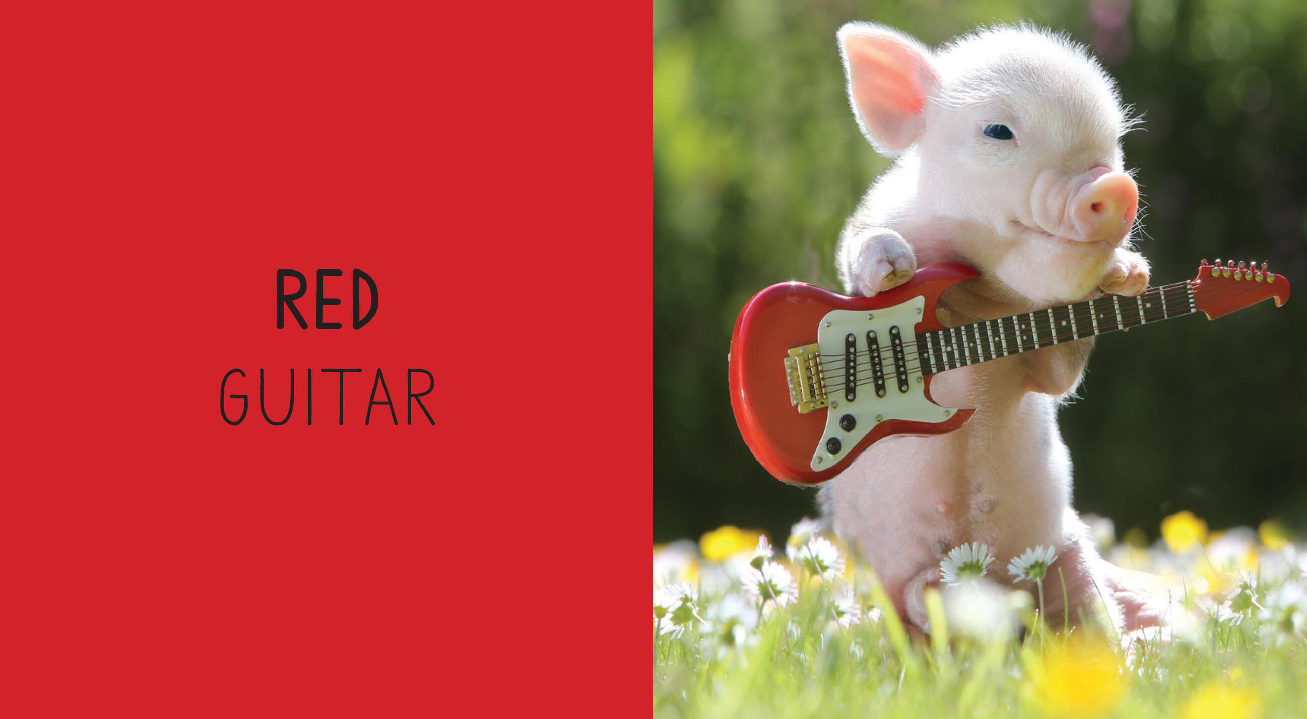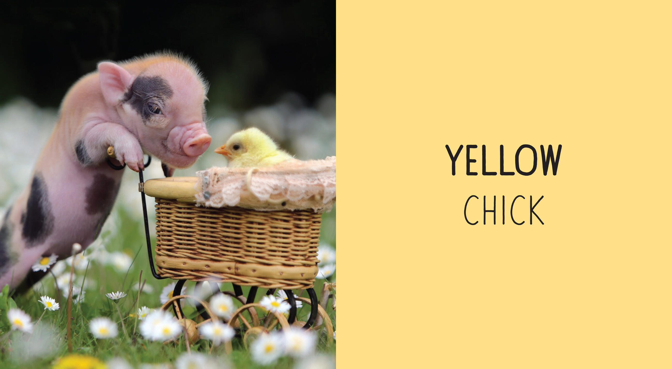 The Pocket Piggies board books marry the inherent appeal of Teacup Pigs to the sweetness of the board book format. The photographs are full-color, full-page, and up-close. The subjects are classics: On each spread of Pocket Piggies Colors!, one of the beloved piggy models is paired with an object or animal of a different color—like a little piggy holding a red guitar or checking out a yellow chick.