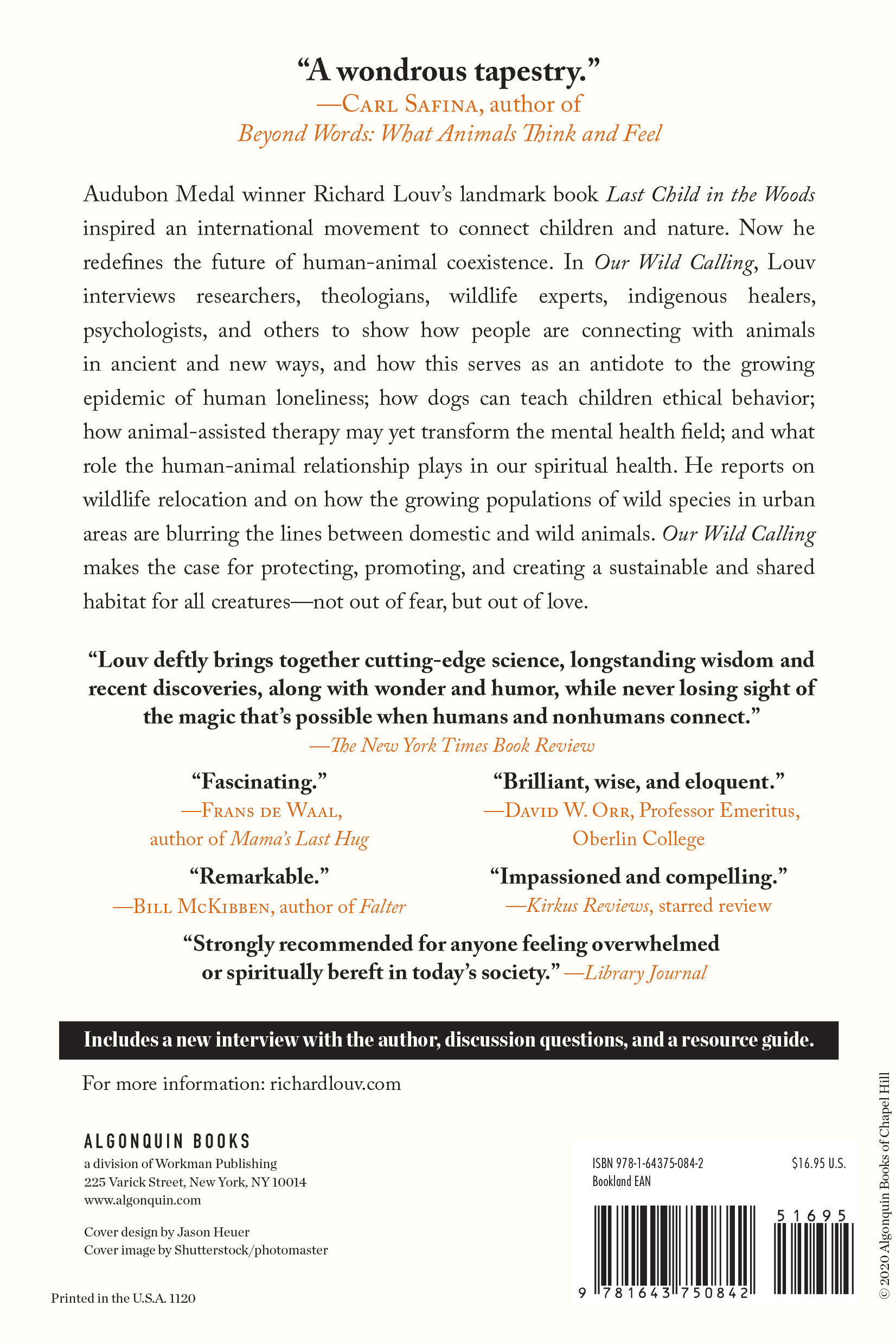 “The timing for Our Wild Calling could not be better. Louv suggests that humans who have strong relationships with animals help their own mental health as well as possibly saving life on earth. This book is incredibly important to our future on this planet.”