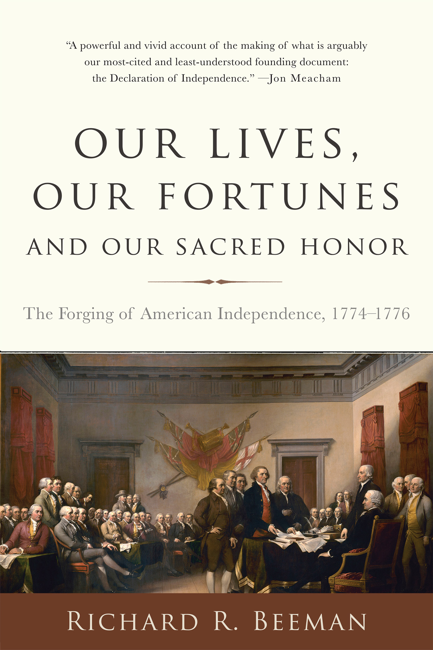 In Our Lives, Our Fortunes and Our Sacred Honor, acclaimed historian Richard R. Beeman examines the grueling twenty-two-month period between the meeting of the Continental Congress on September 5, 1774 and the audacious decision for independence in July of 1776. As late as 1774, American independence was hardly inevitable — indeed, most Americans found it neither desirable nor likely. When delegates from the thirteen colonies gathered in September, they were, in the words of John Adams, “a gathering of strangers.” Yet over the next two years, military, political, and diplomatic events catalyzed a change of unprecedented magnitude: the colonists’ rejection of their British identities in favor of American ones. In arresting detail, Beeman brings to life a cast of characters, including the relentless and passionate John Adams, Adams’ much-misunderstood foil John Dickinson, the fiery political activist Samuel Adams, and the relative political neophyte Thomas Jefferson, and with profound insight reveals their path from subjects of England to citizens of a new nation.