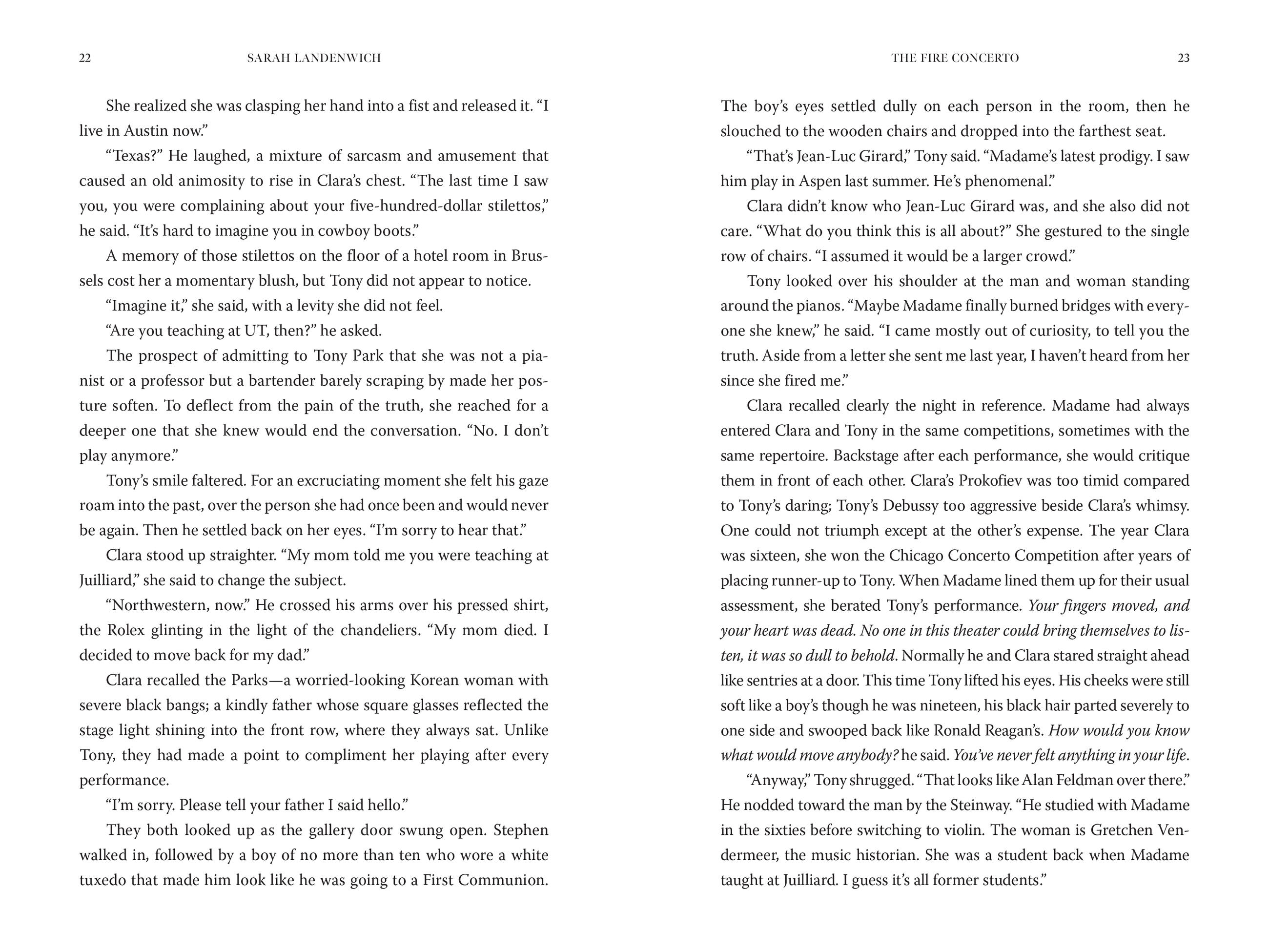 • "The Fire Concerto is a mesmerizing story of passion, suspense, and heartbreak. In a remarkable feat of the imagination, debut novelist Sarah Landenwich portrays three women across time whose ardent pursuit of music brings them joy and devastation. Their stories have stayed with me long after I reached the final page."