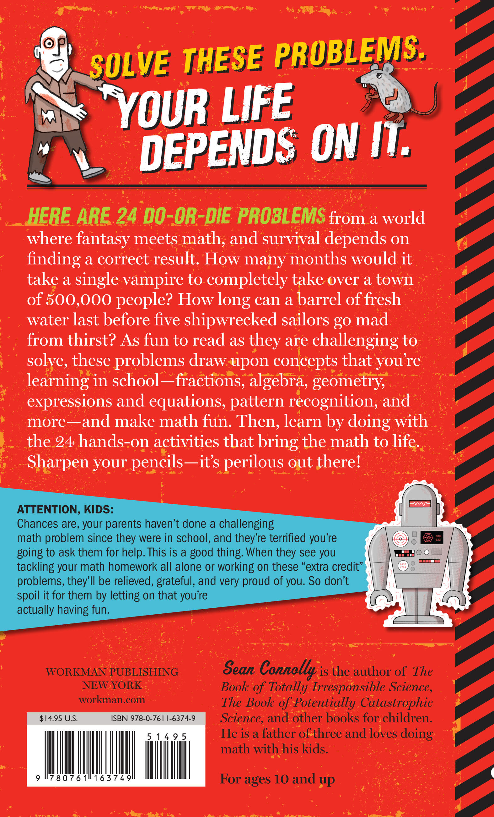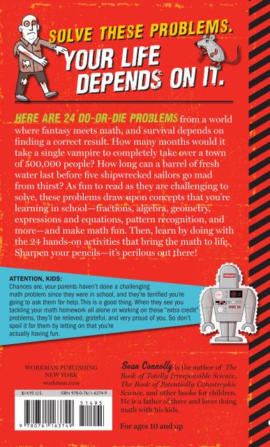 Math rocks! At least it does in the gifted hands of Sean Connolly, who blends middle school math with fantasy to create an exciting adventure in problem-solving. These word problems are perilous, do-or-die scenarios of blood-sucking vampires (How many months would it take a single vampire to completely take over a town of 500,000 people?), or a rowboat of 5 shipwrecked sailors with a single barrel of freshwater (How much can they drink, and for how long, before they go mad from thirst???). Each problem requires readers to dig deep into the tools they’re learning in school to figure out how to survive.