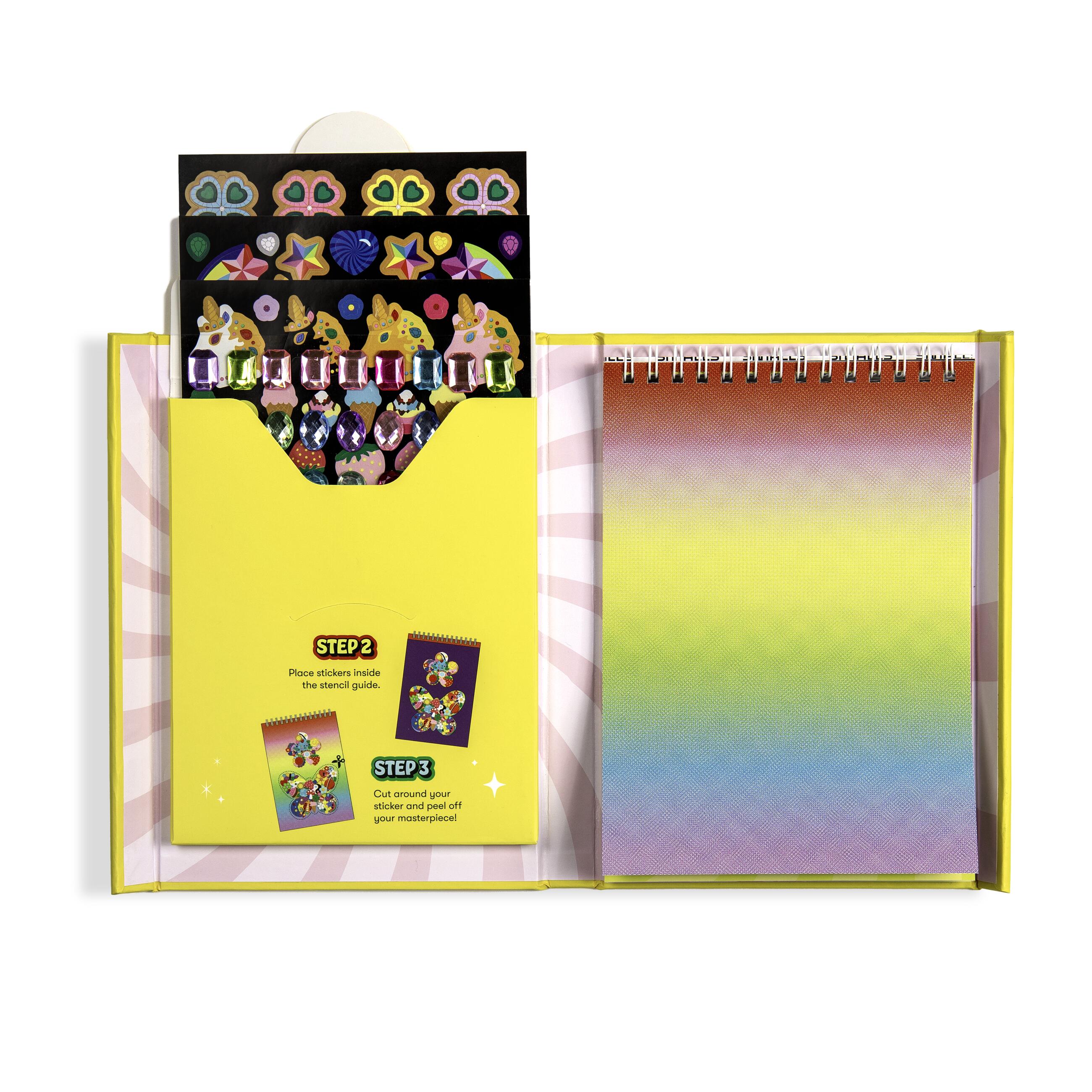 The fold-out portfolio features 10 pages of colorful sticker backgrounds on a wire-o pad. Budding child designers use a sturdy plastic stencil and the hundreds of colorful stickers and 3-D gemstone stickers to finish the designs. The finished works of art can then be peeled out of the pad and placed on any sticker-friendly surface to create unique works of art.
