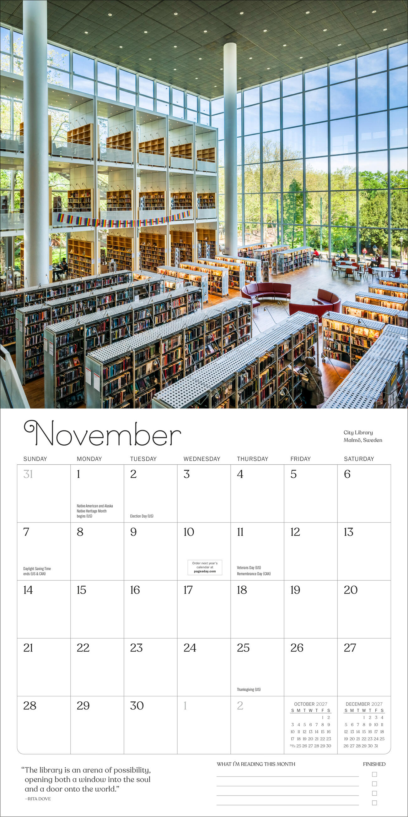 - BOOKISH BEAUTY: Each month highlights places dedicated to books, from grand libraries to cozy bookstores. Gorgeous photography is paired perfectly with quotes about the joys of books and reading.