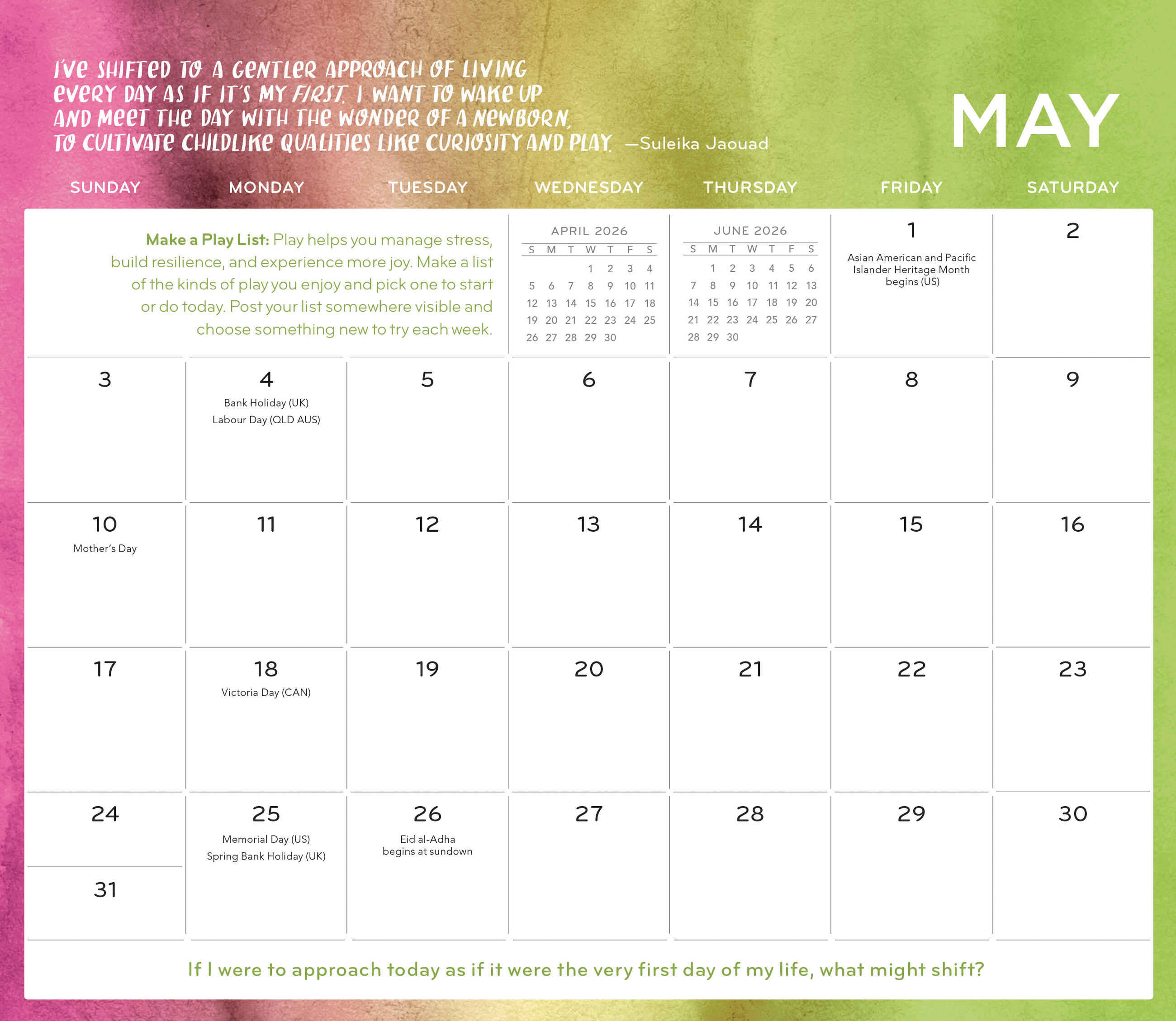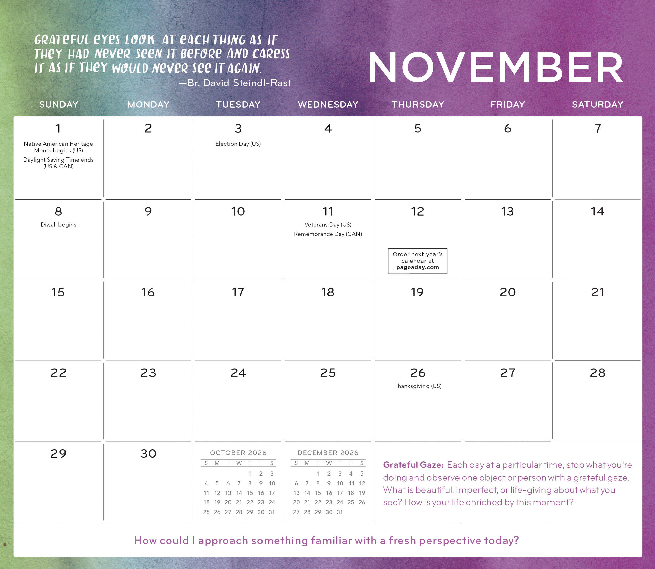 - PURPOSEFUL PRACTICES: Gratitude Practices appear throughout the calendar to help you exercise your thankfulness: Each day at a particular time, stop what you’re doing and observe one object of person with a grateful gaze.