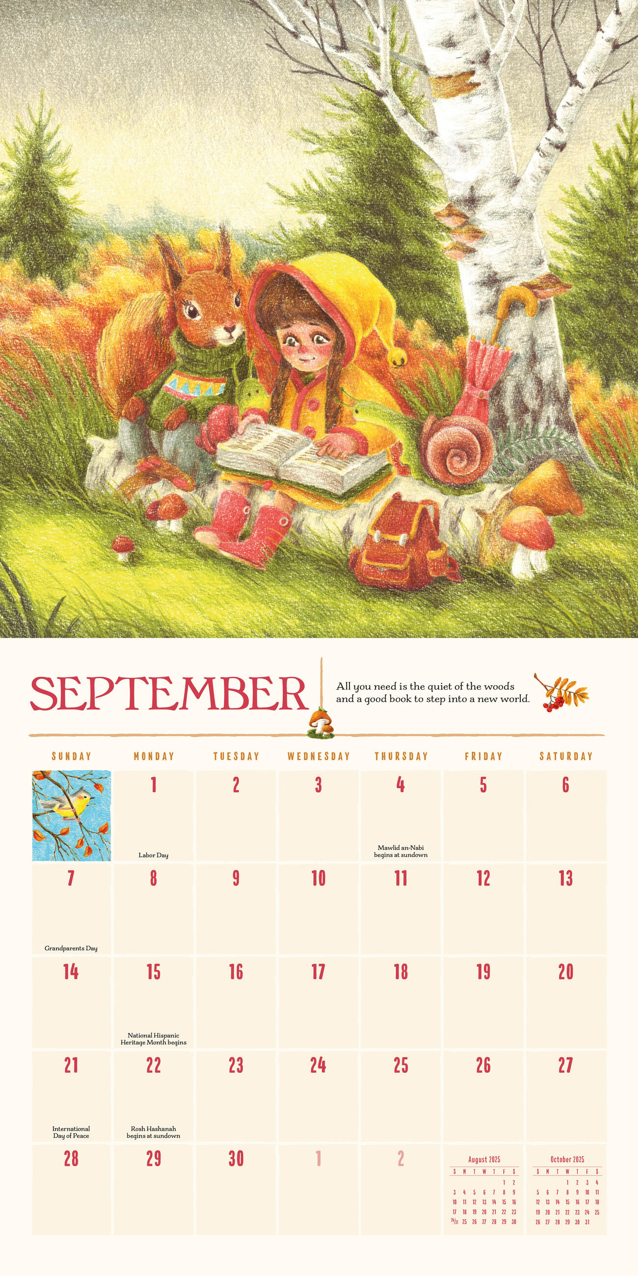 A year of charming color illustrations of trendy gnomes, mushrooms, and woodland creatures – paired with uplifting life lessons.