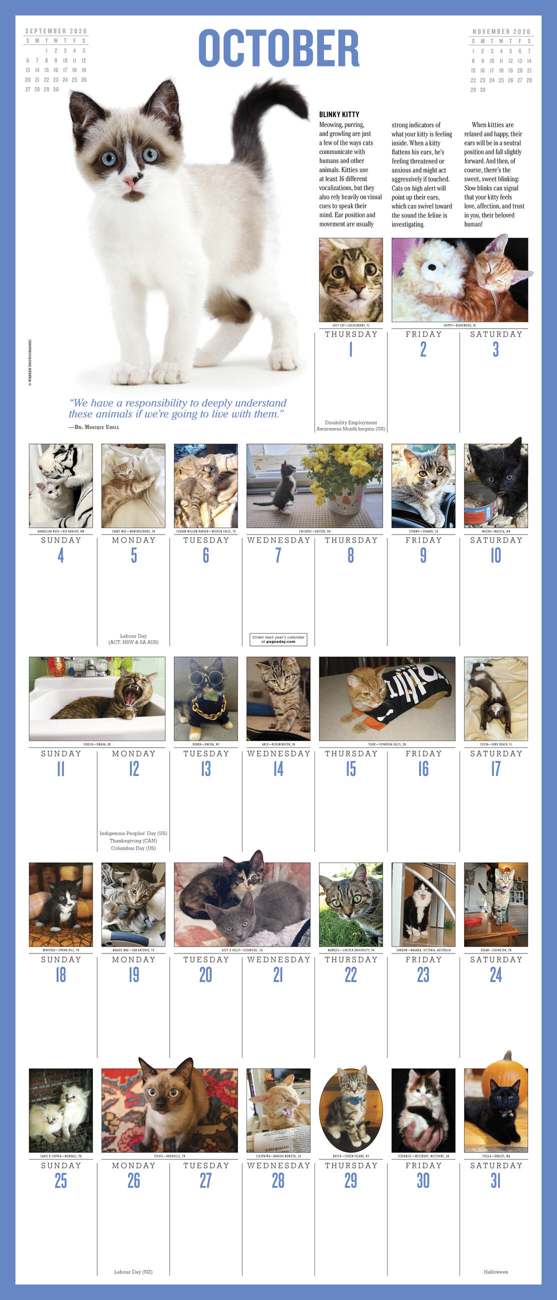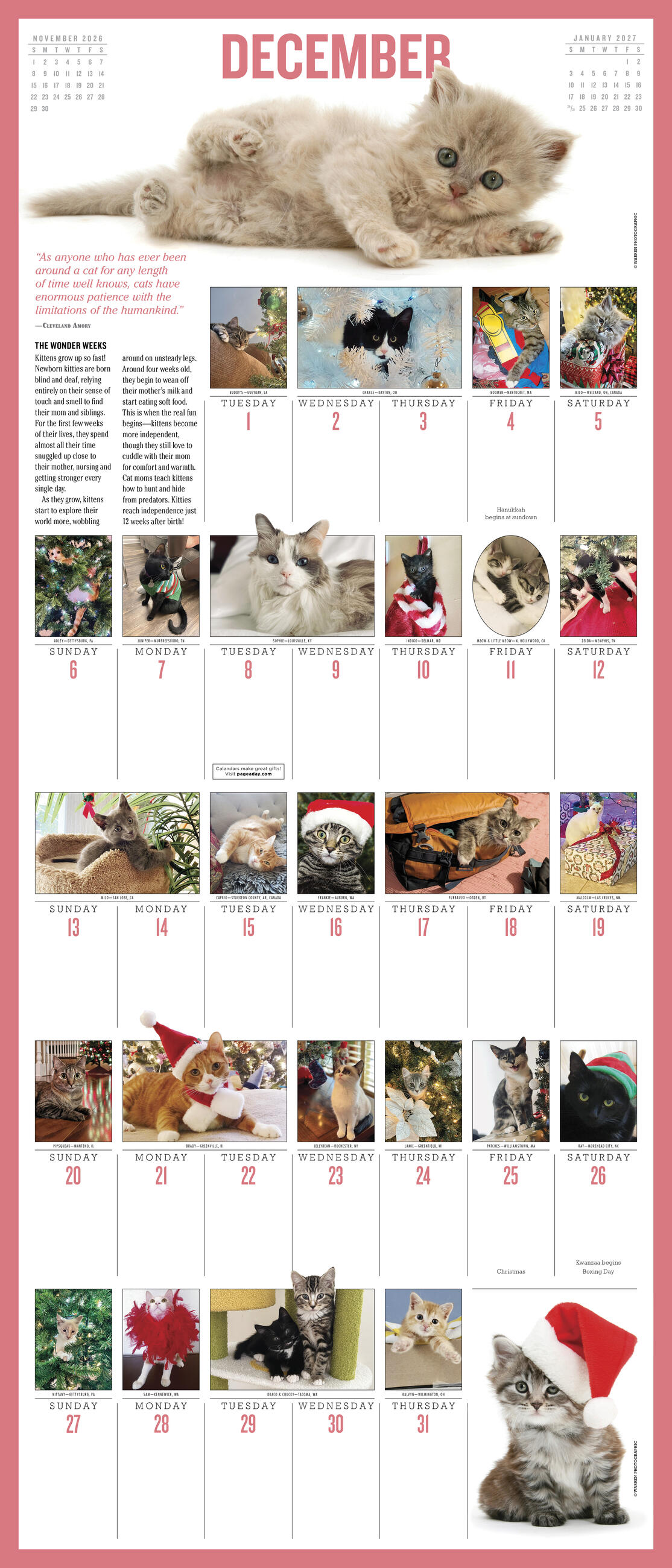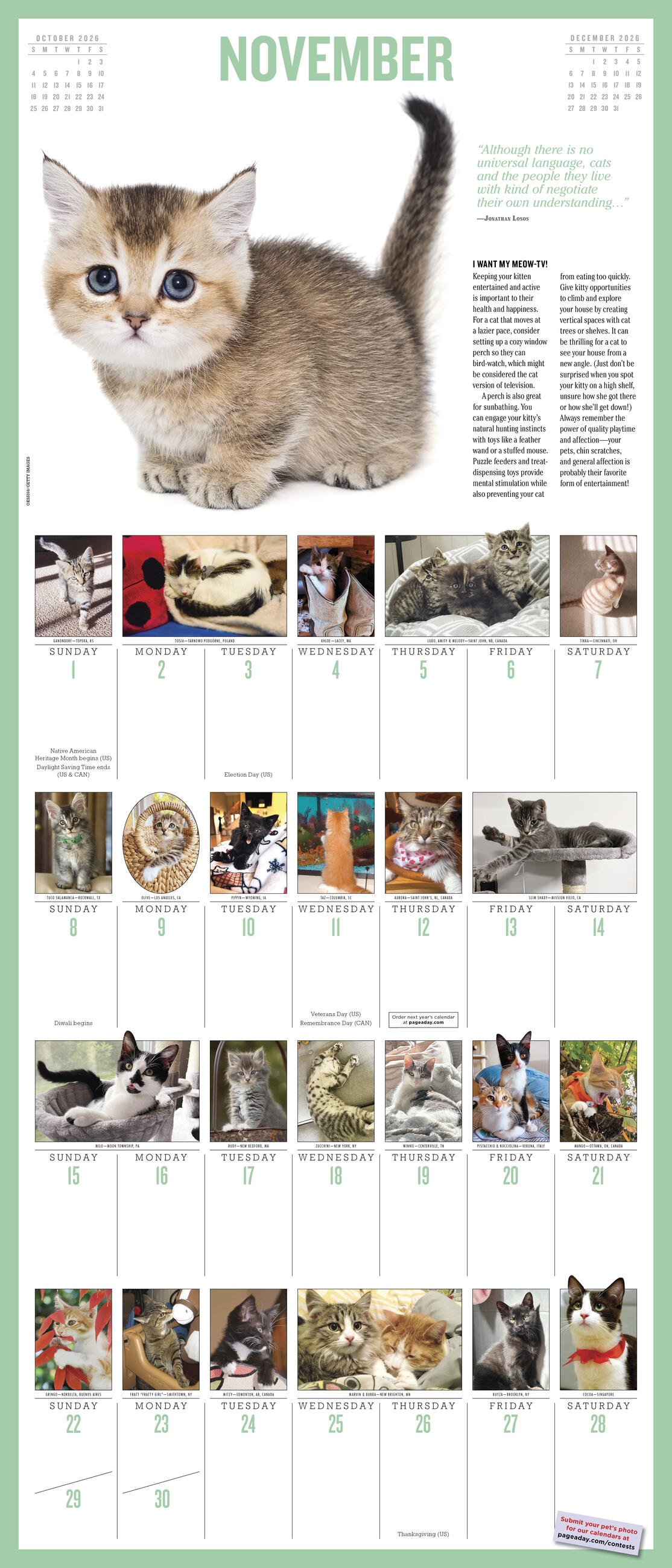 - FELINE FUN: Each month features a large full-color photograph at the top of the page and dozens more throughout the grid, plus kitten quotes, fascinating facts, and tips for caring for your cat.