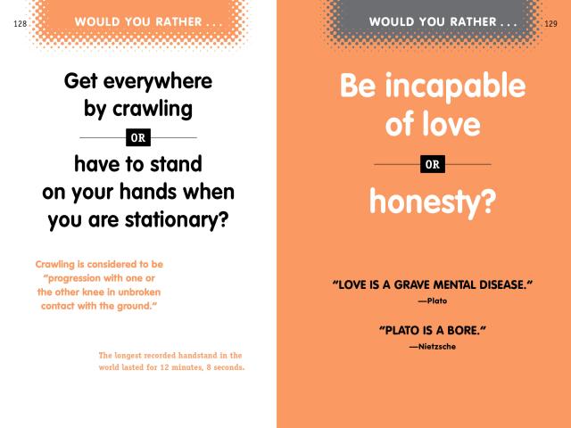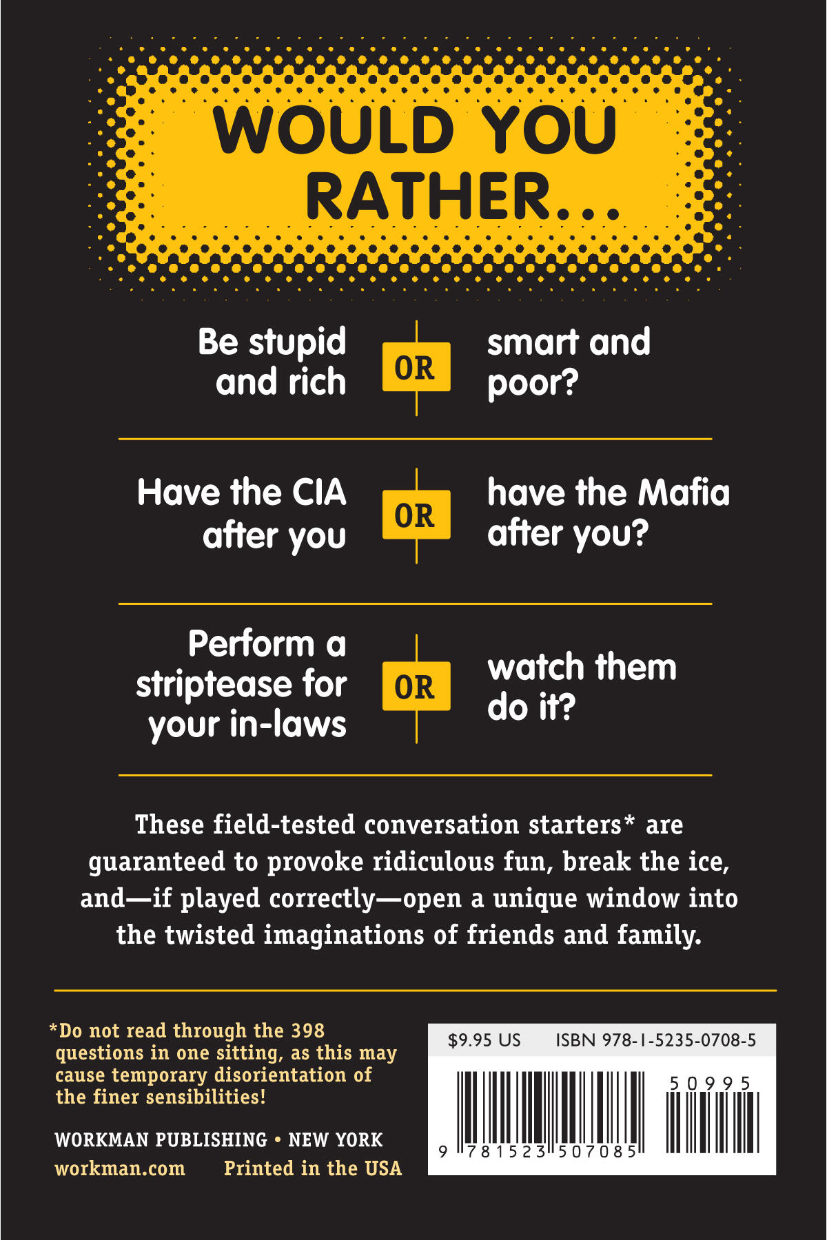 Warning! This book contains shocking content meant to inspire hilarious discussion. These field-tested conversation starters are guaranteed to provoke ridiculous fun, break the ice, and—if played correctly—open a unique window into the twisted imaginations of friends and family. It’s an addictive game in a book that challenges readers to ask—and answer—more than 100 questions that rank from the heinous to the outrageously funny.