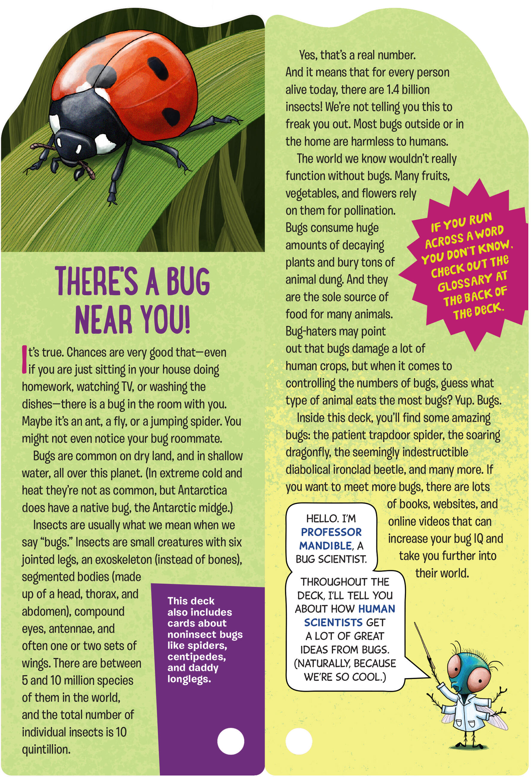 Learn about the bombardier beetle and its diabolical defense mechanism: If attacked, it sprays its enemy with a boiling hot chemical fluid. Or the honeybee, with its impressive ability to pollinate so many of our crops while making that delicious treat: honey. Each card is illustrated in bold, lifelike detail and includes information about the creature’s habits and habitat. And a special “Learning from Nature” section describes how bugs inspire inventions in medicine, engineering, and even programming!